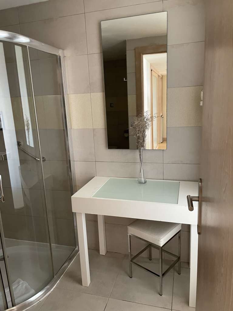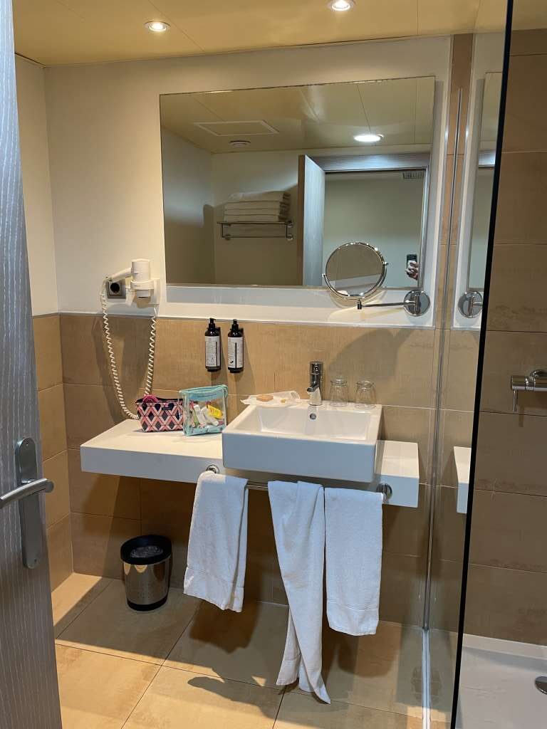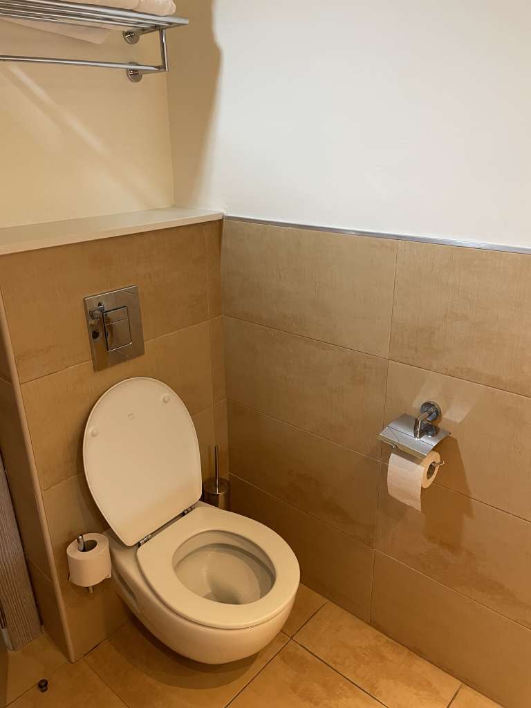 Das Badezimmer war an das Schlafzimmer angegliedert und verfügte neben dem WC auch über ein Bidet. Die Dusche war allerdings deutlich kleiner als im vorherigen Familienzimmer. Dafür gab es noch einen Schminktisch, den ich mangels Schreibtisch als Arbeitsplatz zweckentfremdete.