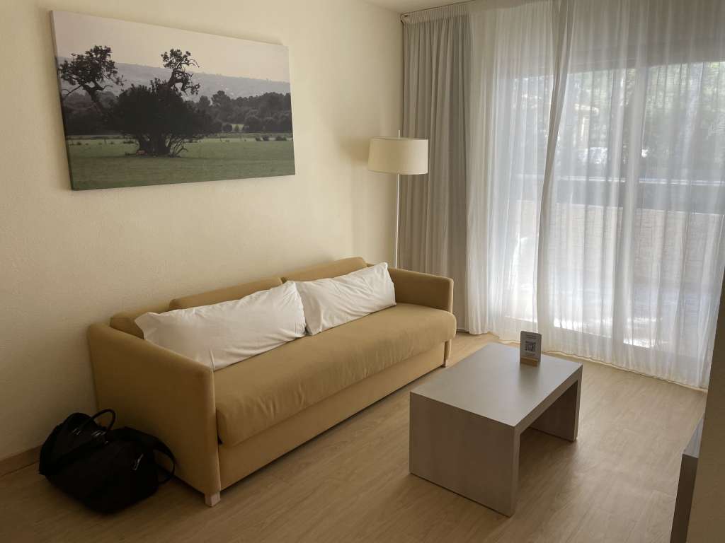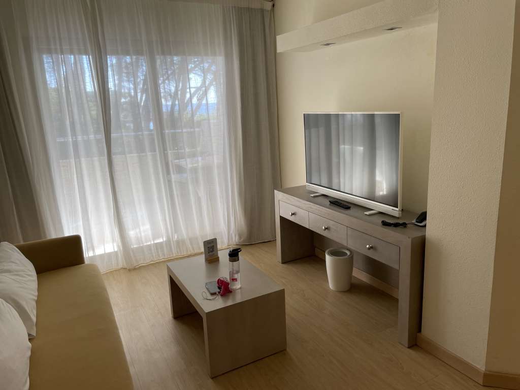 Hinter einem Raumteiler erstreckte sich dann der Wohnbereich mit einer Eckcouch, die in unserem Fall für die Kinder aufgebettet war. Auf einem Sideboard stand hier auch der Flachbildfernseher und über eine Glastür ging es auf die Terrasse mit einem kleinen Tisch und vier Stühlen. Über die Poollandschaft, vorbei an einem anderen Gebäude, hatten man den versprochenen Meerblick.