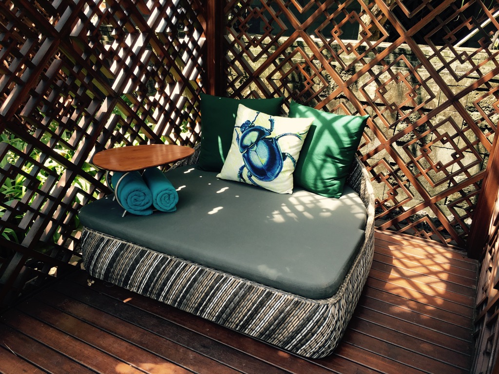 Vom Schlaf-/Wohnbereich aus gelangte man auch auf den großzügigen Balkon. Auf dem Balkonbefand sich eine große, gemütliche Hängecouch. Man hatte einen fantastischen Blick über das begrünte Gelände des Hotels.