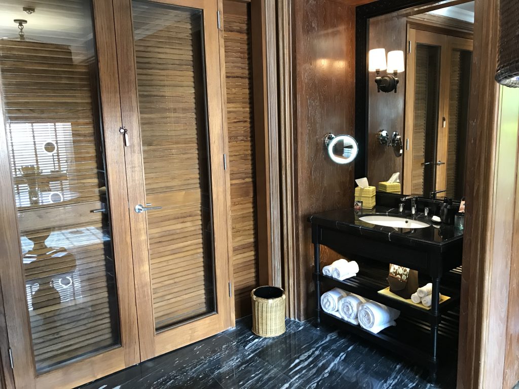 In der Mitte des Bades stand ein großer Waschtisch, mit allerlei Amenities und einem großen Spiegel.