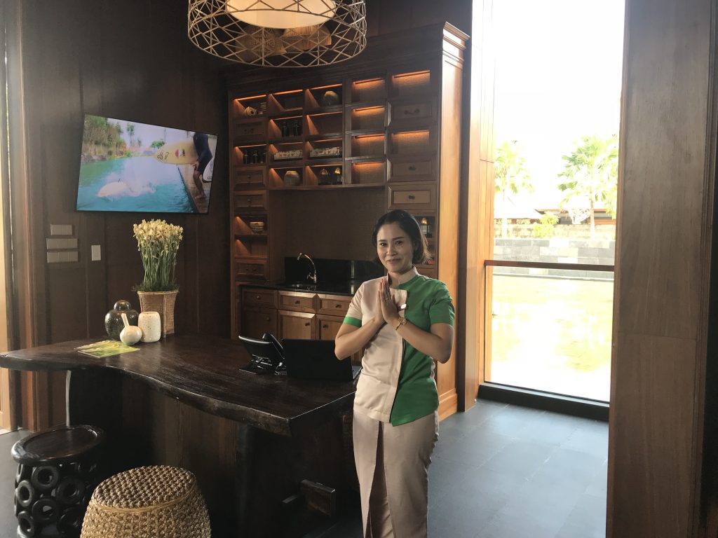 Auf Nachfrage durften wir auch eine Pool Villa besichtigen. Die Pool Villas liegen etwas abseits von dem Hotelkomplex und damit sehr ruhig. Jede Pool Villa hat ein eigenes Farbthema, was an der Einganstür zum Villabereich beginnt.
