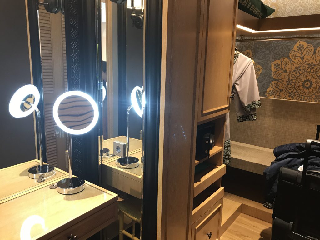 Am Eingangsbereich grenzt ein begehbarer Kleiderschrank mit Schminktisch an. Natürlich verfügte der Schrank auch über die üblichen Dinge wie Fön, Safe etc.