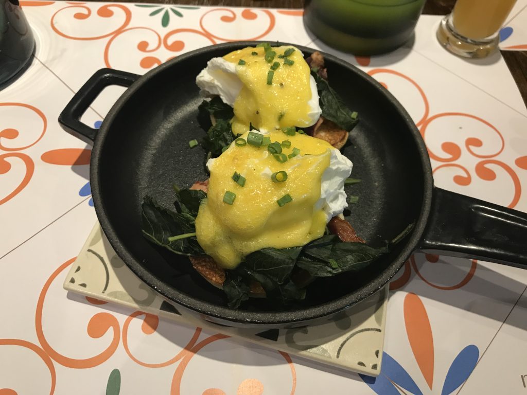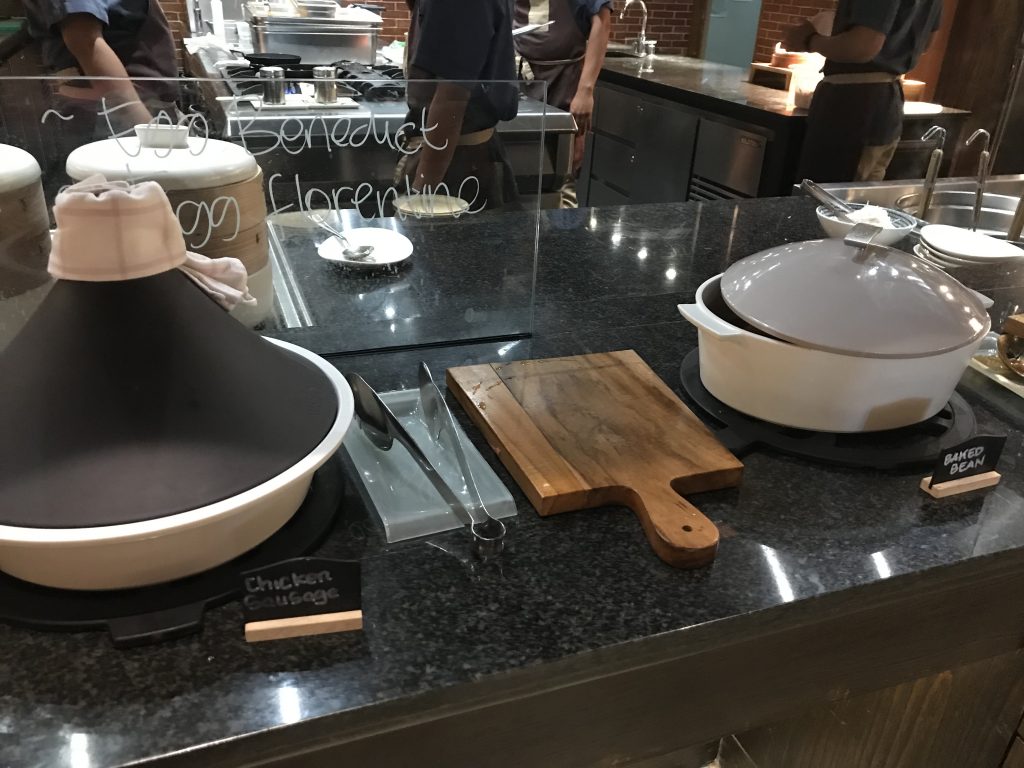 Auf dem Buffet waren neben Backwaren, Aufschnitten, Marmeladen und süßen Aufstrichen, Obst, warmen Gerichten und den üblichen Dingen noch eine Eier- und eine Waffelstation. An diesen Stationen wurden Eierspeisen, Waffeln und Pancakes auf Wunsch zubereitet und ebenfalls an den Platz gebracht.