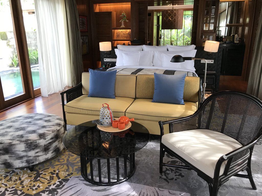 In der eigentlichen Pool Villa hat das große Kind Size Bett dominiert. Es stand mitten im Raum und war beeindruckend in Szene gesetzt. Davor befand sich ein kleiner Wohnbereich mit einer Couch und Stühlen und einem Fernseher.