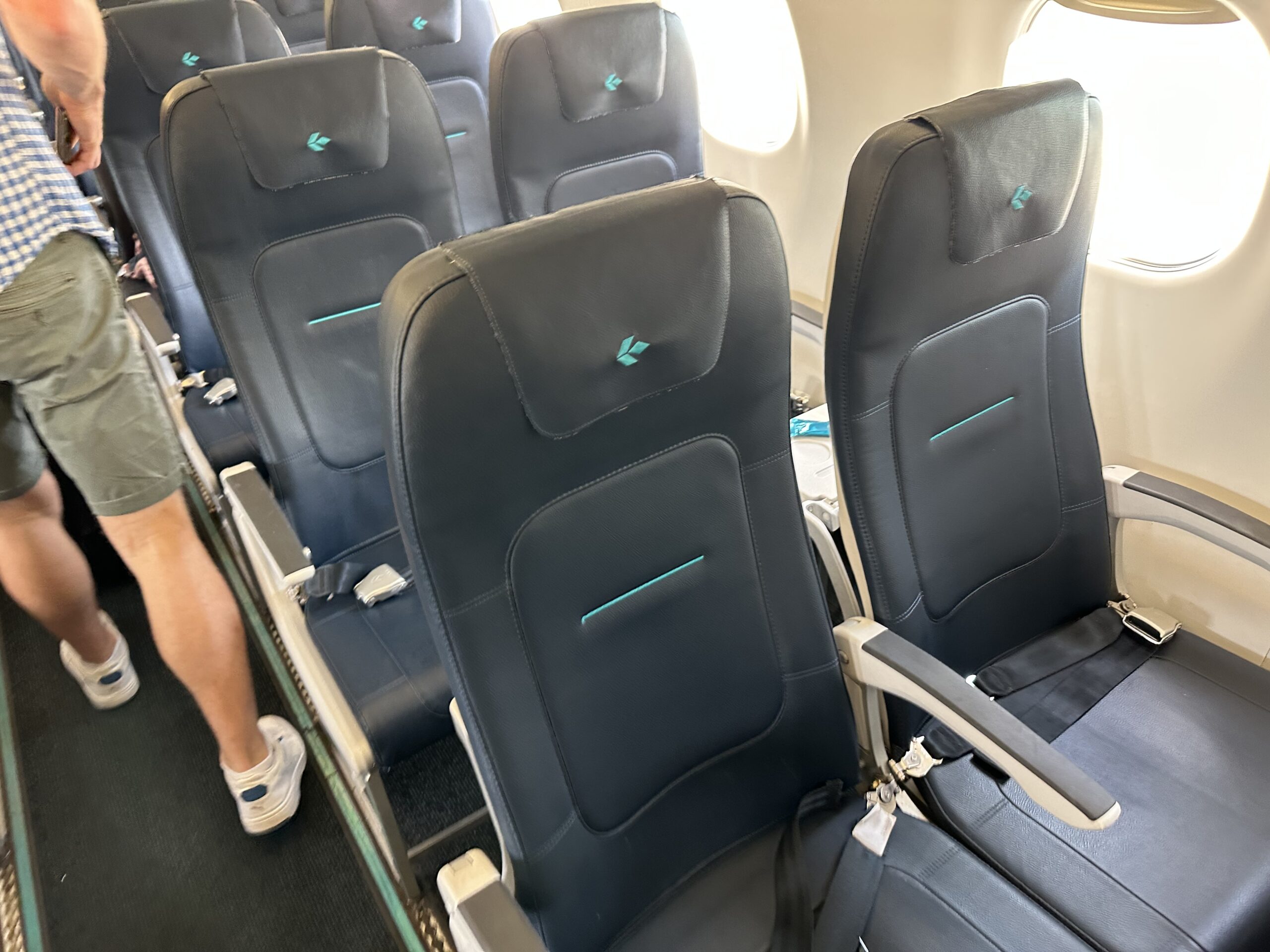 Die eingesetzte Embraer ist in einer 2-2 Konfiguration bestuhlt, in der Business Class bleibt der Nebensitz frei. Hier lagen für die Gäste bereits Wasserflaschen und Erfrischungstücher bereit.
