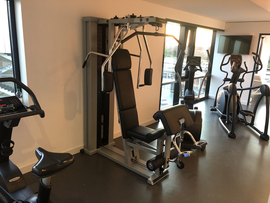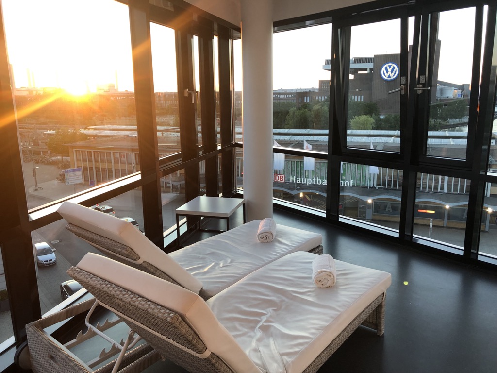 Im einem der oberen Stockwerke bietet das Hotel einen kleinen Fitnessbereich mit Cardio- und Krafttrainingsgeräten an. Außerdem findet sich hier auch eine Sauna, die eine wirklich tolle Aussicht auf den Bahnhofsvorplatz des Wolfsburger Hauptbahnhofs bietet.