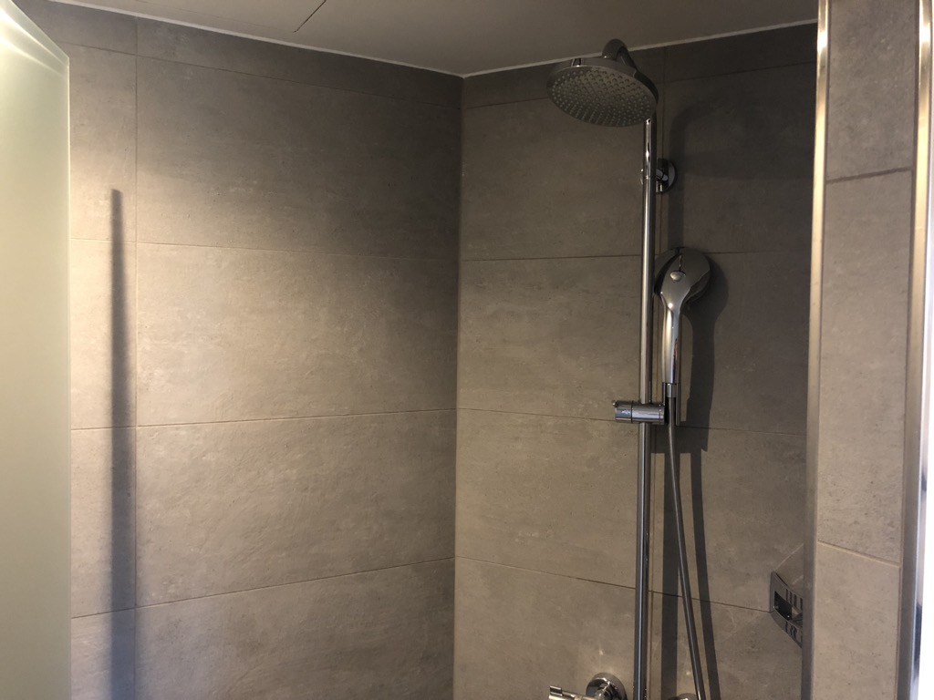 Das Badezimmer verfügte über eine großräumige Dusche – inklusive Regendusche. Dazu gab es ein extra abgetrenntes kleines Zimmer mit der Toilette. Zudem wurden neben der Minibar auch eine Nespresso-Maschine sowie Bademäntel und einige weitere Amenities angeboten.