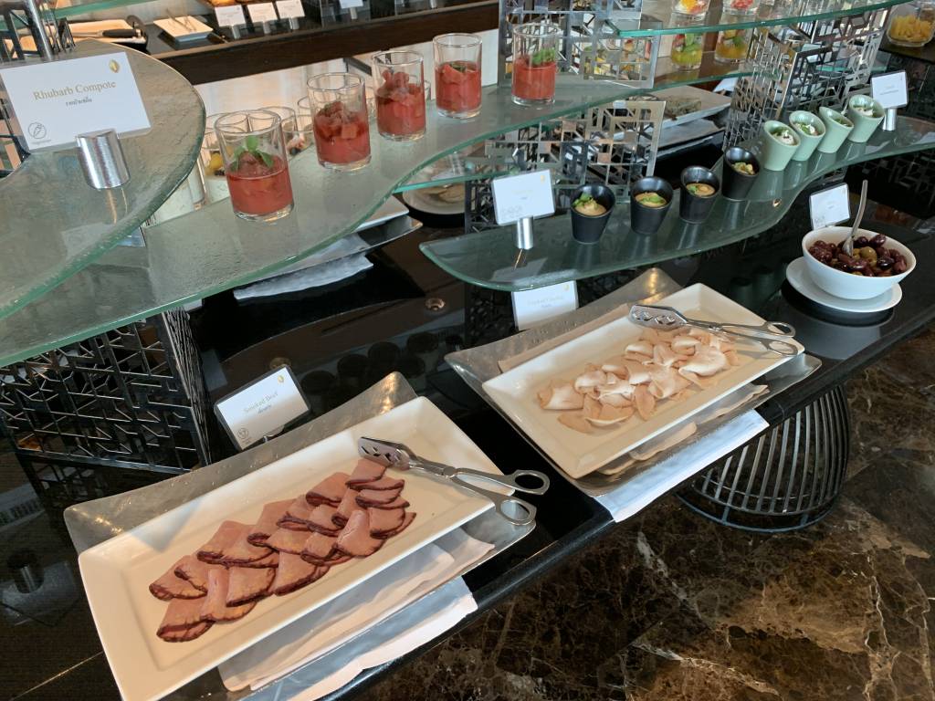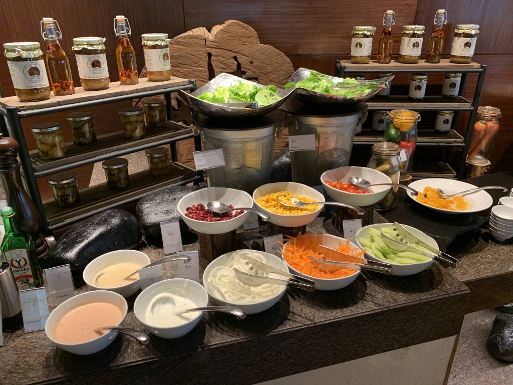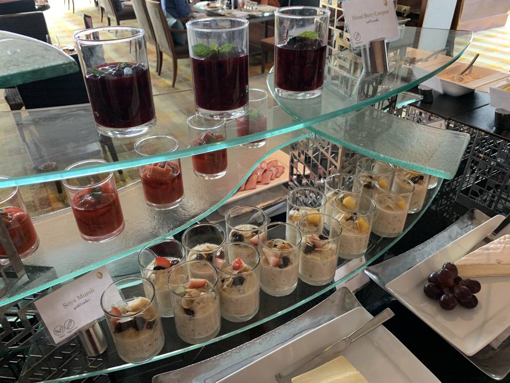 Daher könnt Ihr sicher erahnen, dass die Auswahl auch sehr umfangreich ist. Natürlich gibt es Brot, Toast und süßes Gebäck in diversen Varianten. Salami, Schinken, Käse und Fisch standen als Aufschnitt zur Verfügung. Natürlich konnten wir auch aus diversen Sorten Cerealien und Müsli wählen. An einem eigenen Bereich konnten wir uns frischen Salat und Obst zusammenstellen, während an der zentralen Insel kleinere Snacks, wie z. B. Bircher Müsli, Fruchtsalat und Kompott darauf warteten, verspeist zu werden. Alles sehr hochwertig ausgewählt und hübsch präsentiert..