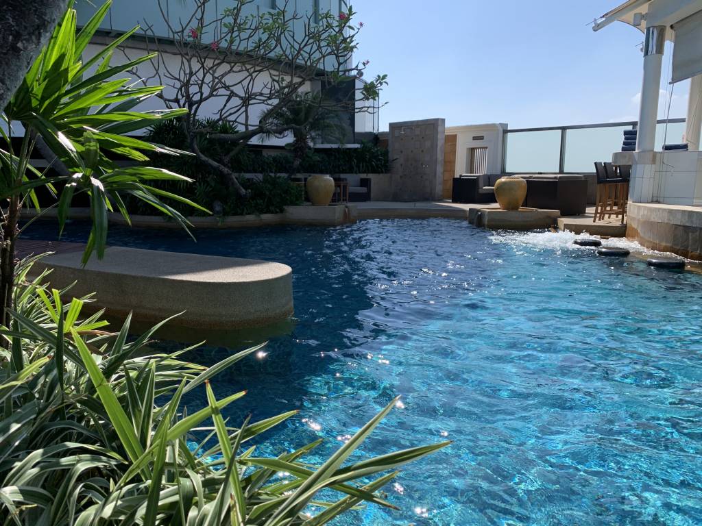 Auf der 37. und damit höchsten Etage des InterContinental Bangkok befindet sich der „Oasis“ genannte Outdoor Pool. Wirklich eine Oase der Ruhe, denn der Pool hat eine überschaubare Größe und war trotzdem zu keinem Zeitpunkt unseres Aufenthalts überfüllt. Durch die zahlreichen Grünpflanzen und den teilweise verlegten Holzboden vergaßen wir schnell, dass wir uns mitten im geschäftigen Bangkok befinden.