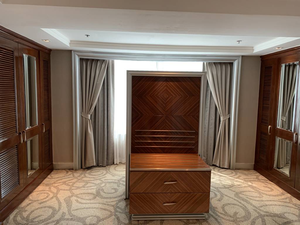 Und das Schlafzimmer ist mit seiner Aussicht über Bangkok und sogar auf den Erawan Schrein das wirkliche Prunkstück der Suite. Die komplette Breite des Zimmers verfügt dabei über eine Fensterfront. Lediglich der frei im Raum stehende Fernseher versperrt minimal den Blick nach draußen. Vom riesigen Bett aus konnten wir perfekt die Aussicht genießen. In einer Ecke des Raumes ist noch ein zusätzlicher Schminktisch in die Wand eingebaut.