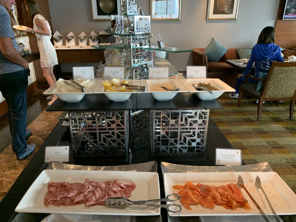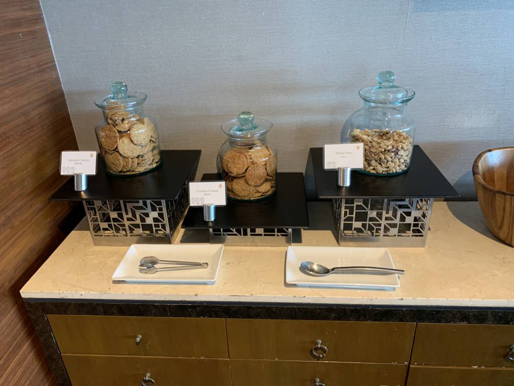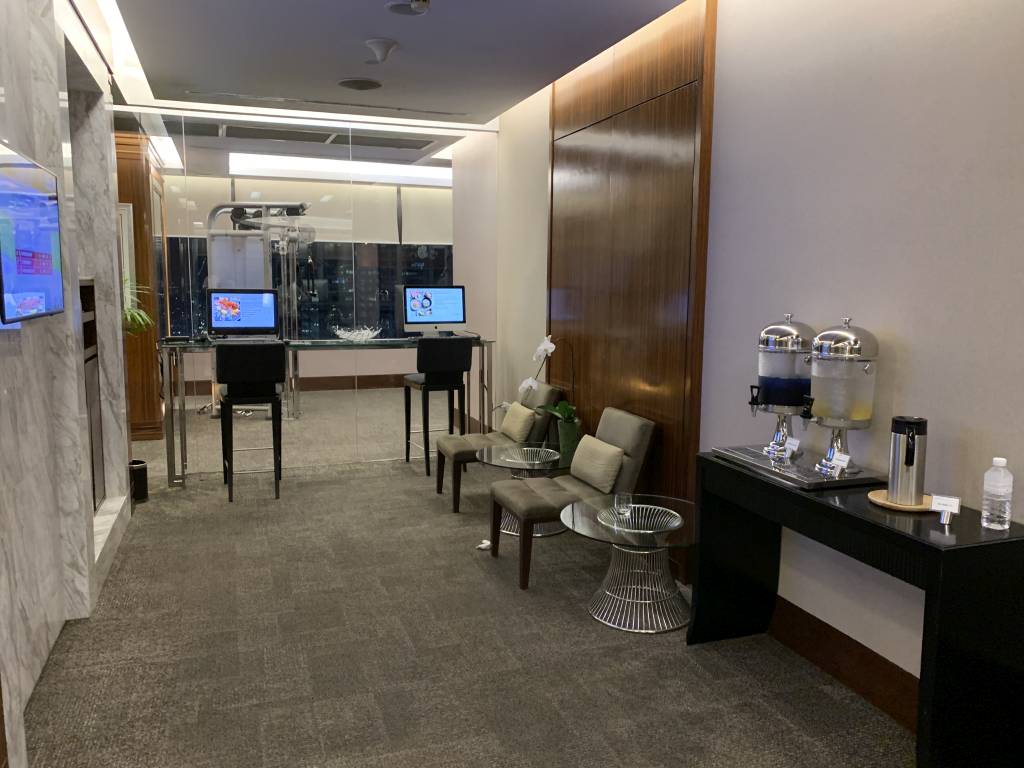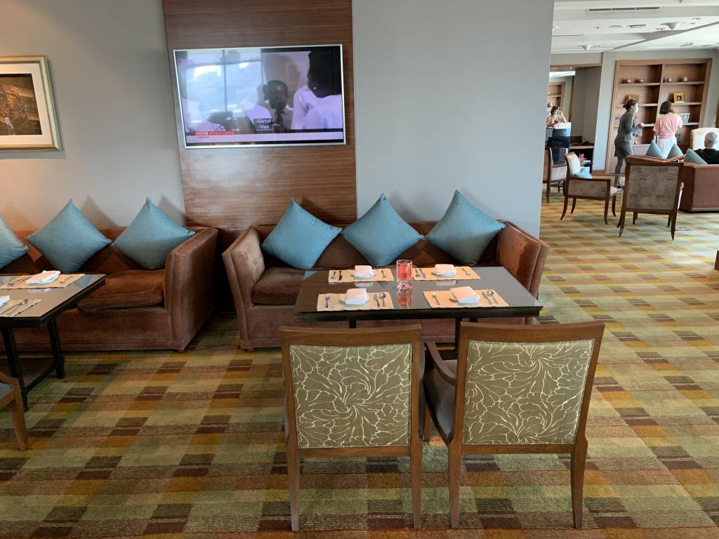 In der Club Lounge wurden wir direkt freundlich begrüßt und zu einem freien Tisch begleitet. Während wir unsere Dokumente und eine Kreditkarte überreichten, wurden wir nach unseren Getränke-Wünschen gefragt. Da es kein Ginger Ale in der Club Lounge gab, entschieden wir beiden uns für ein Glas Wasser.