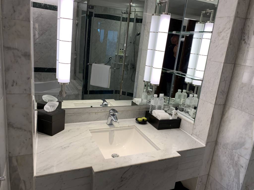 Das Badezimmer verfügt über eine separate Dusche, sowohl mit Hand-Duschkopf und fest installierter Regendusche, und eine große Badewanne. In die Badewanne war bei Ankunft ein Schaumbad eingelassen, welches mit Rosen dekoriert war. Spätestens jetzt war uns klar, dass aus der angekündigten Babymoon- eine Honeymoon-Reise geworden war. Nicht schlimm, denn während der Reise feierten wir ja auch unseren zweiten Hochzeitstag. Das Marmor-Badezimmer wird noch durch einen großen Waschtisch und das WC vervollständigt.