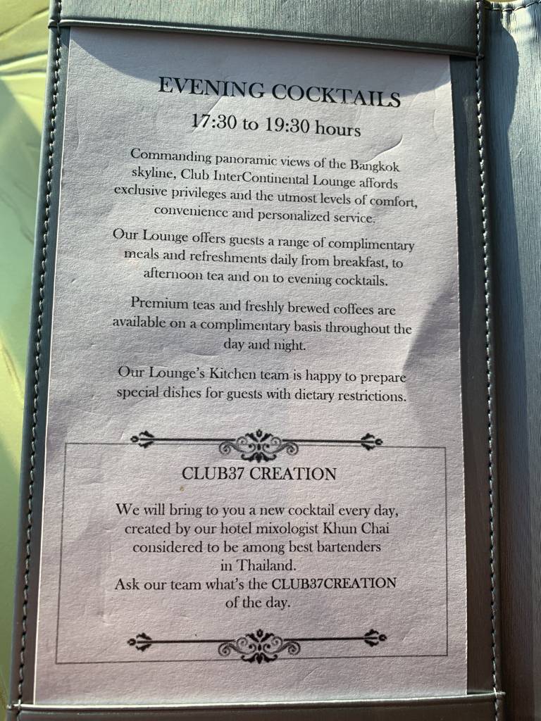 Und so tat ich es dann auch, um mir von drei Mitarbeitern an zwei Abenden erklären zu lassen, dass man keinen Champagner habe und mir deswegen auch keinen Champagner servieren werde (ich verrate sicher nicht zu viel, wenn ich hier anmerke, dass Champagner natürlich auf der Karte der kostenpflichtigen Getränke stand). Während sich Chanon, ein ganz herausragender Mitarbeiter im Club, noch extrem bemühte und selbst meinen Gesprächsverlauf mit IHG zu dem Thema und den Link zur Webseite notierte, war da das Gespräch mit einem anderen Mitarbeiter sehr beschämend. Denn am zweiten Abend kam nach meiner Reklamation ein Mitarbeiter, der sich selber nicht weiter vorstellte, zu uns (Also er stellte sich selbst als Franzose vor, aber nannte weder Name noch Funktion. Ich vermute, dass er Club Manager war). Und der Herr wollte uns doch tatsächlich erklären, dass man im Club InterContinental Bangkok doch lieber einen guten Cava oder Prosecco als einen schlechten Champagner serviere. Peinlich an der Geschichte war nach meinem Empfinden, dass der angebotene Sparkling Wine in europäischen Supermärkten zum Preis von 5-10 Euro erhältlich ist. Dafür bekommt man natürlich weder guten noch schlechten Champagner. Zum Glück war dies jedoch das einzig negative Erlebnis im InterContinental Bangkok.