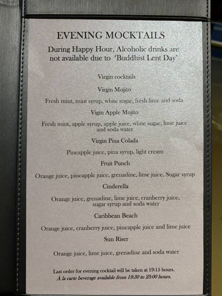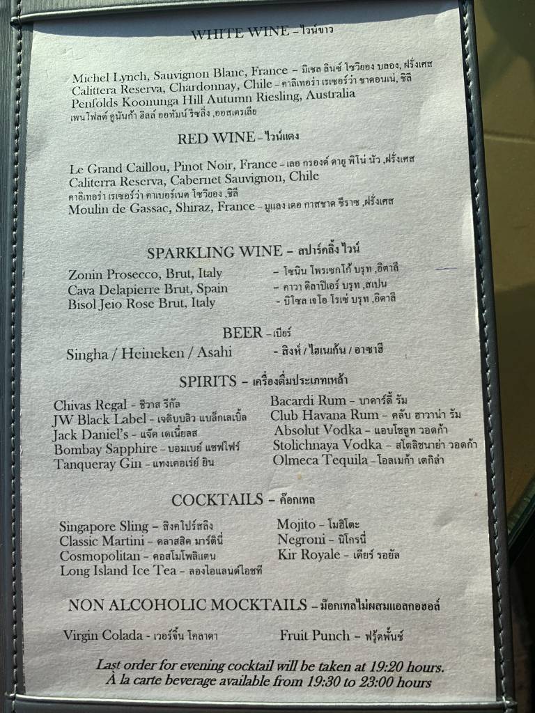 Alkoholische Getränke werden durchgehend und sehr aufmerksam am Tisch serviert. In der Karte fanden sich diverse Weiß- und Rotweine, Biere (Heineken, Asahi und Singha), mittelpreisige Spirituosen (z.B. Tanqueray Gin, Chivas Regal und Olmeca Tequila), Cocktails (z.B. Singapore Sling, Mojito, Long Island Ice Tea) und Sparkling Wine (Prosecco, Cava und ein Rose)… Stop! Halt! Sparkling Wine!? Hier wurde unsere Guest-Experience dann leider einen Moment (oder auch zwei Abende) lang etwas befremdlich…