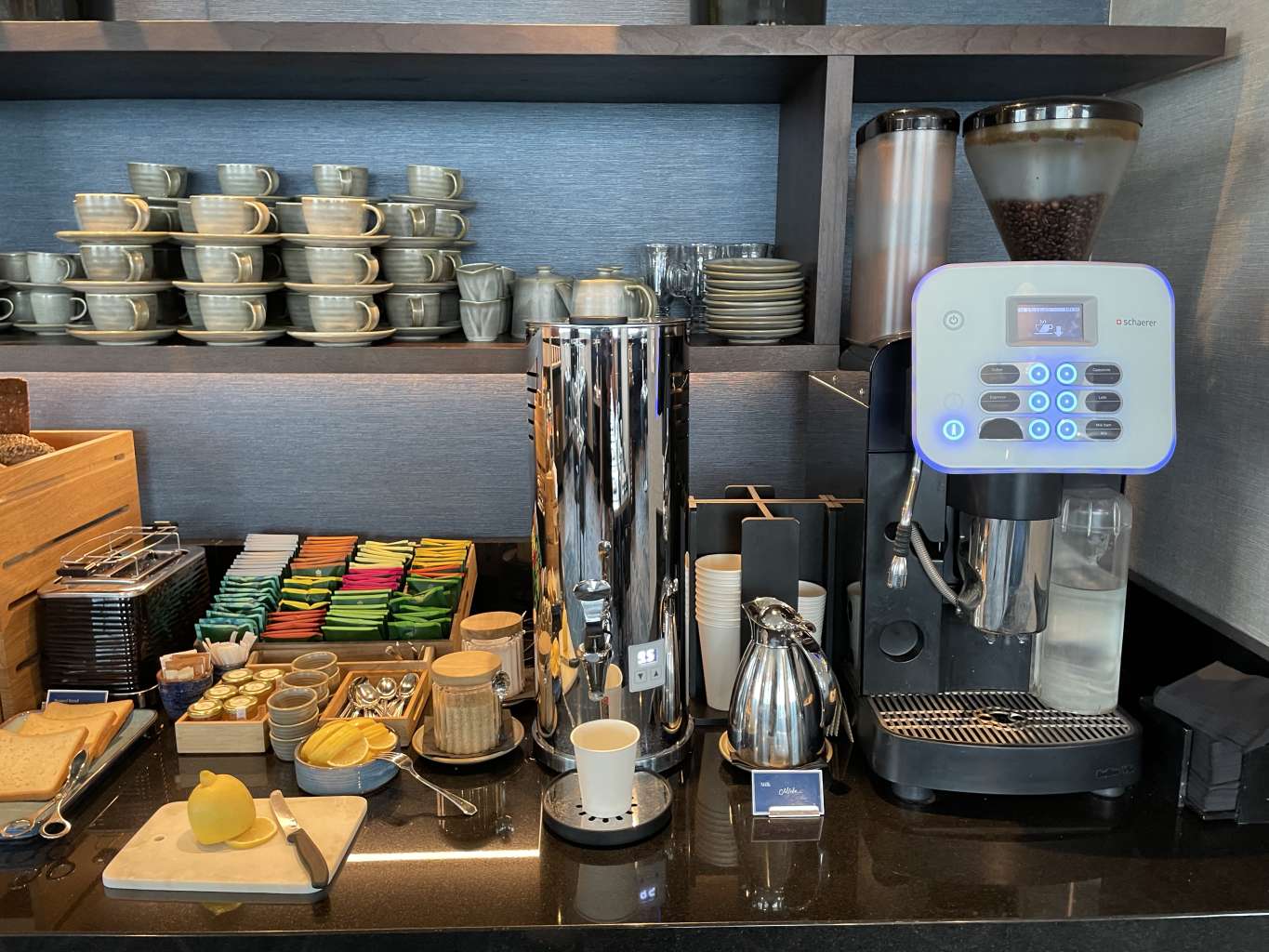 Heiße Getränke, wie Kaffeespezialitäten und Tees, werden ebenfalls am Tisch serviert. Zur Selbstbedienung stehen aber auch ein Kaffeeautomat, zahlreiche Teesorten und diverse Säfte bereit.