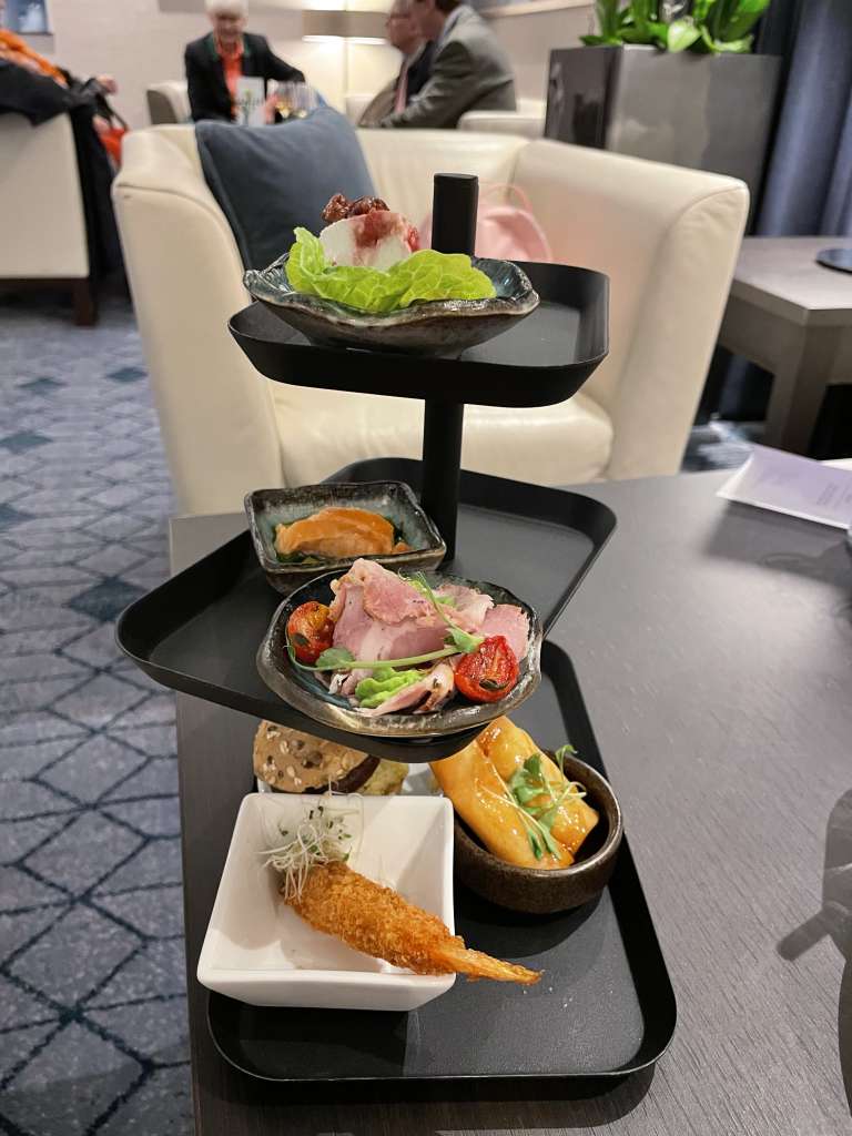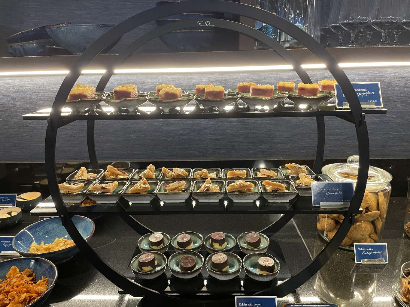 Parallel zur Cocktail Hour werden auch Canapees serviert. Jeden Abend stand auf den Tischen eine Speisekarte mit drei warmen und drei kalten Snacks, die nach Wahl am Tisch serviert wurden und die wir auch mehrfach nachbestellen konnten. Am Büffet gab es süße Nachspeisen und Käse.