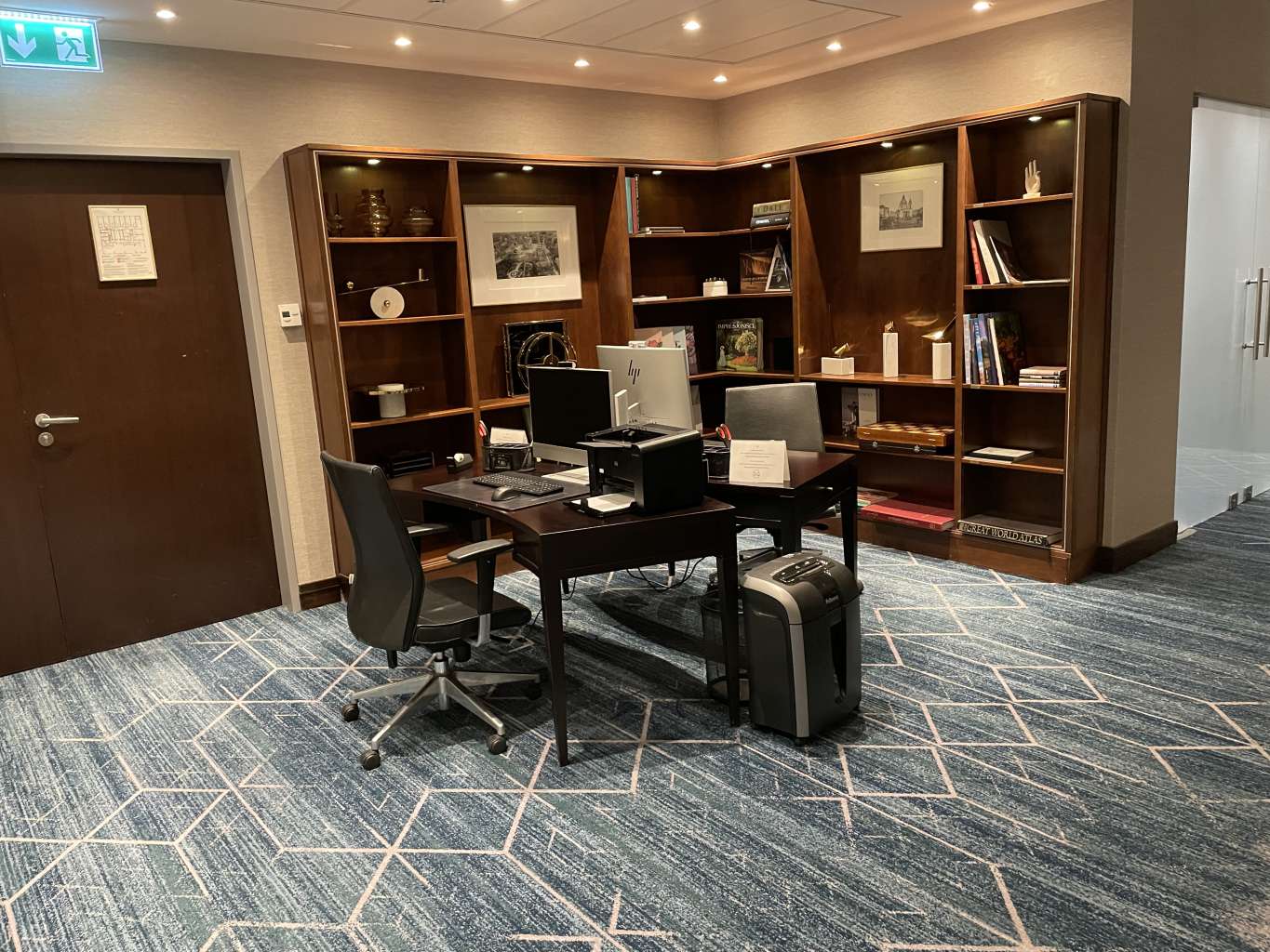 Wendet man sich nach links, gibt es dort einige bequeme Sitzgruppen, zwei PC-Arbeitsplätze in einer Art Bibliothek und am Ende sogar einen Konferenzraum.
