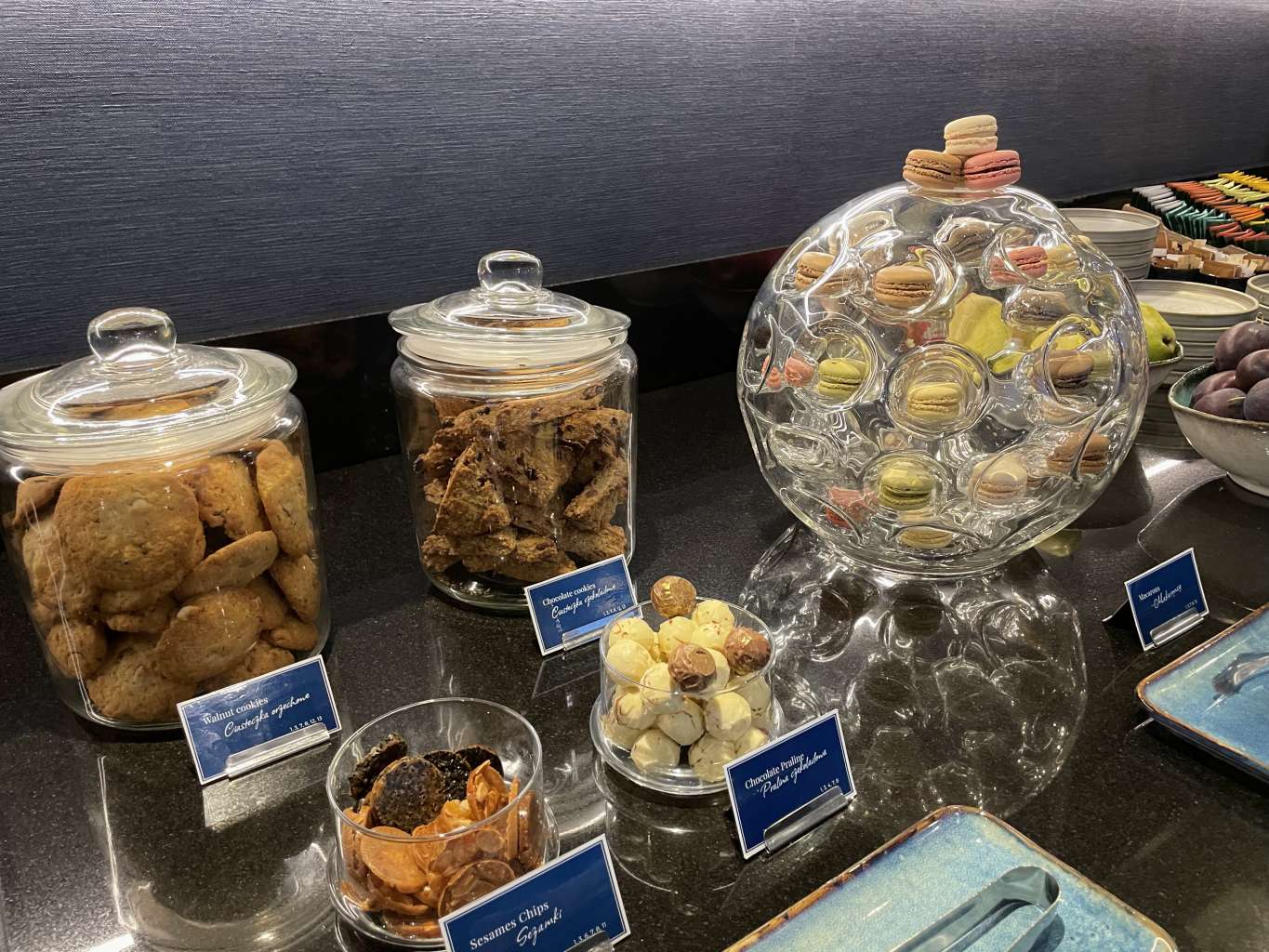 Der Afternoon-Tea wird zwischen 15 und 17:30 Uhr serviert. An einem kleinen Büffet-Form werden Petit fours, Pralinen und Macarons präsentiert. Das Angebot wird durch kleinere herzhafte Häppchen und Sandwiches ergänzt.