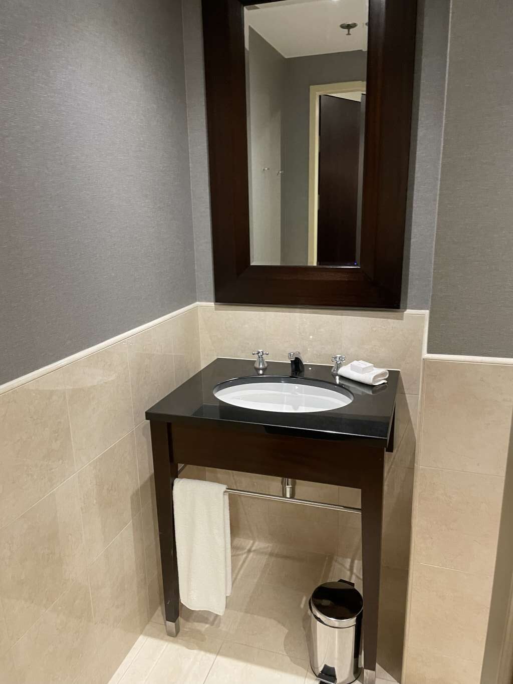 Unsere One-Bedroom-Suite war wie eine klassische Suite aufgebaut. Es gibt einen Wohnraum mit Couch, Sessel, Fernseher, Schreibtisch und einem Gäste-WC. Daran angeschlossen ist das Schlafzimmer mit einem riesigen Kingsize-Bett und einem weiteren Flachbild-TV sowie zwei Schränken mit Spiegeltüren. Vom Schlafzimmer geht es direkt ins Haupt-Badezimmer mit separater Dusche und Badewanne, dem Waschtisch sowie einem WC.