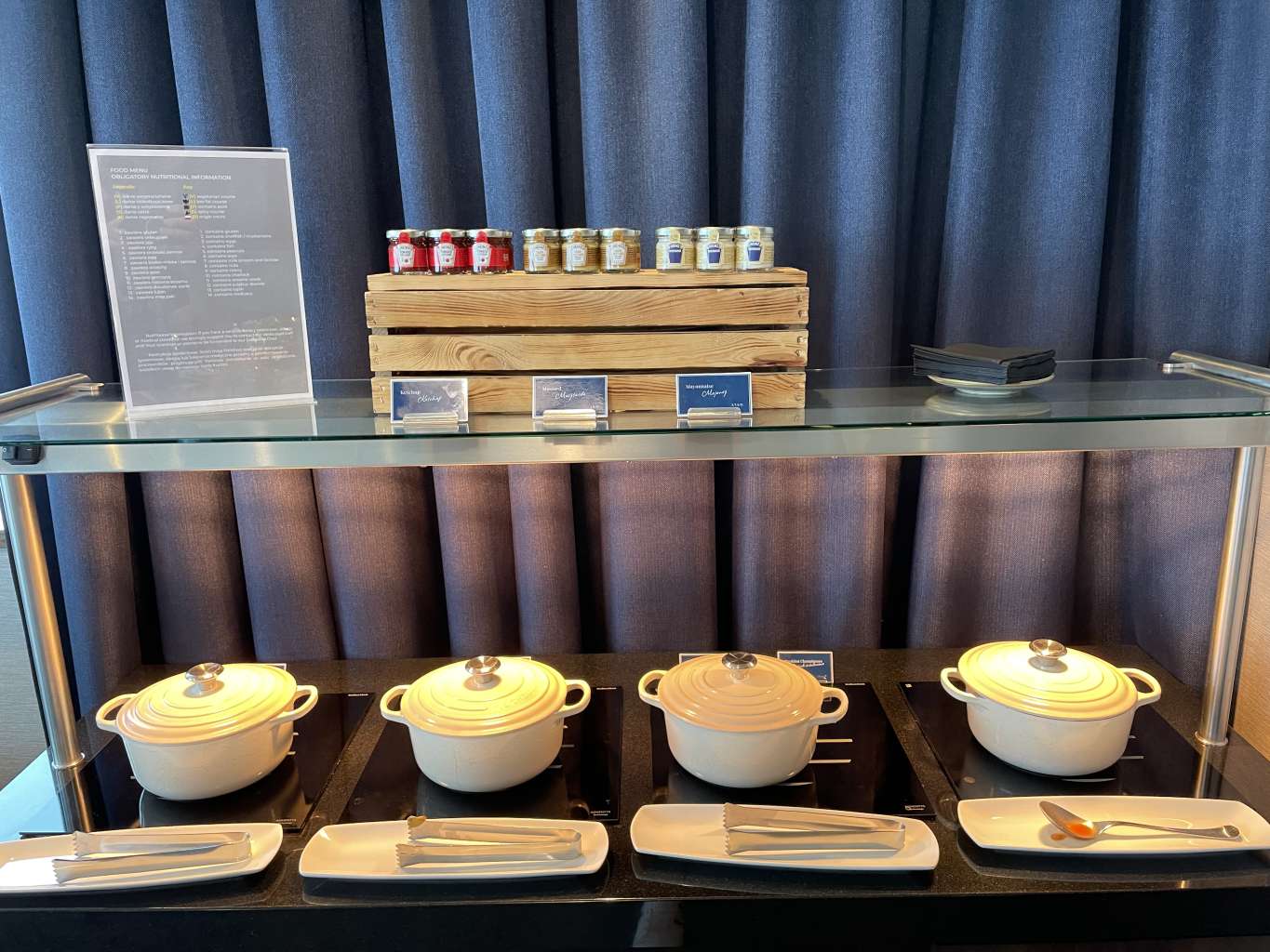 Ein paar warme Gerichte, wie Champignons und Würstchen gibt es ebenfalls zur Selbstbedienung. Wer Eierspeisen oder andere warme Optionen möchte, kann diese direkt beim Personal bestellen.