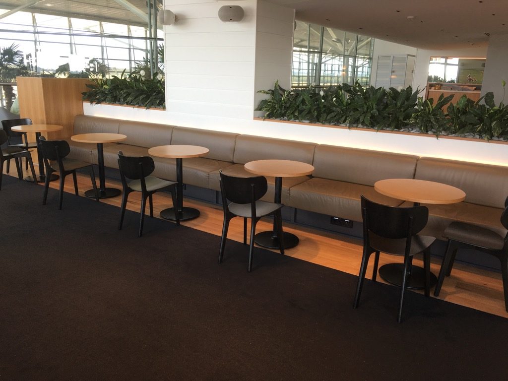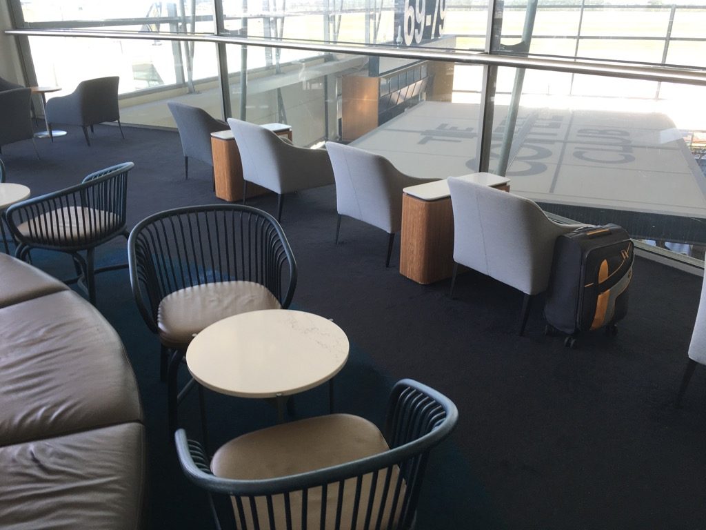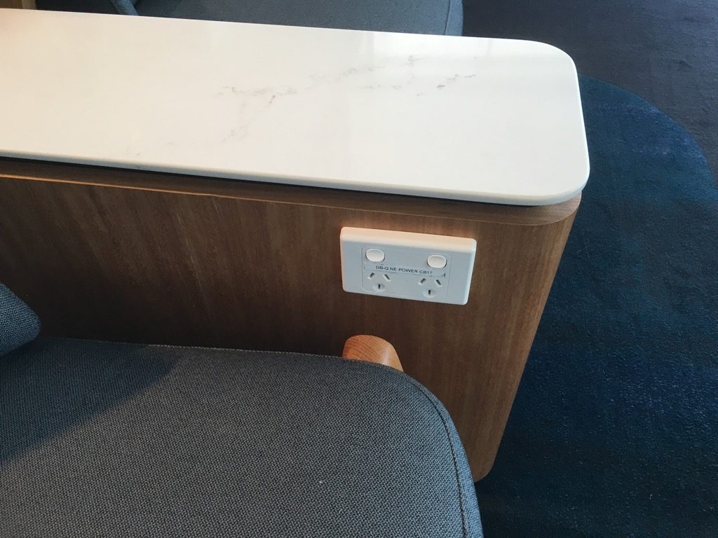Entlang der großen Fensterfront hin zum Terminal befindet sich der eigentliche Loungebereich mit vielen Sesseln und Bänken in verschiedenen Sitzgruppen. Durch die aufgelockerte Anordnung wirkte die Lounge nie besonders voll. Extrem positiv sind mir die vielen Steckdosen an allen Sitzplätzen aufgefallen. Allerdings gibt es hier „nur“ australische Steckdosen und keine internationalen Steckdosen, wie man es z.B. im Flugzeug hat.