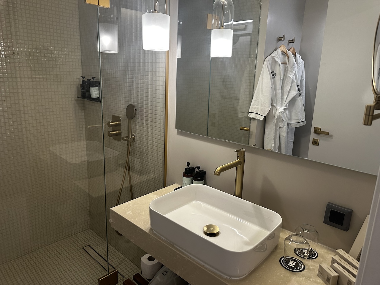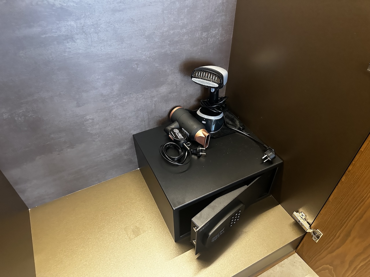 Kühlschrank, Safe und Espressomaschine gehören zur Einrichtung dazu. Das Bad war leider winzig.