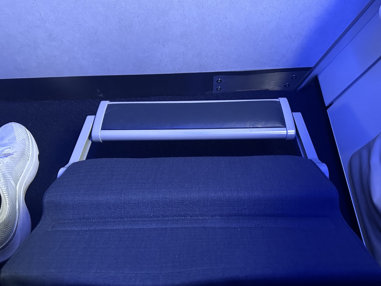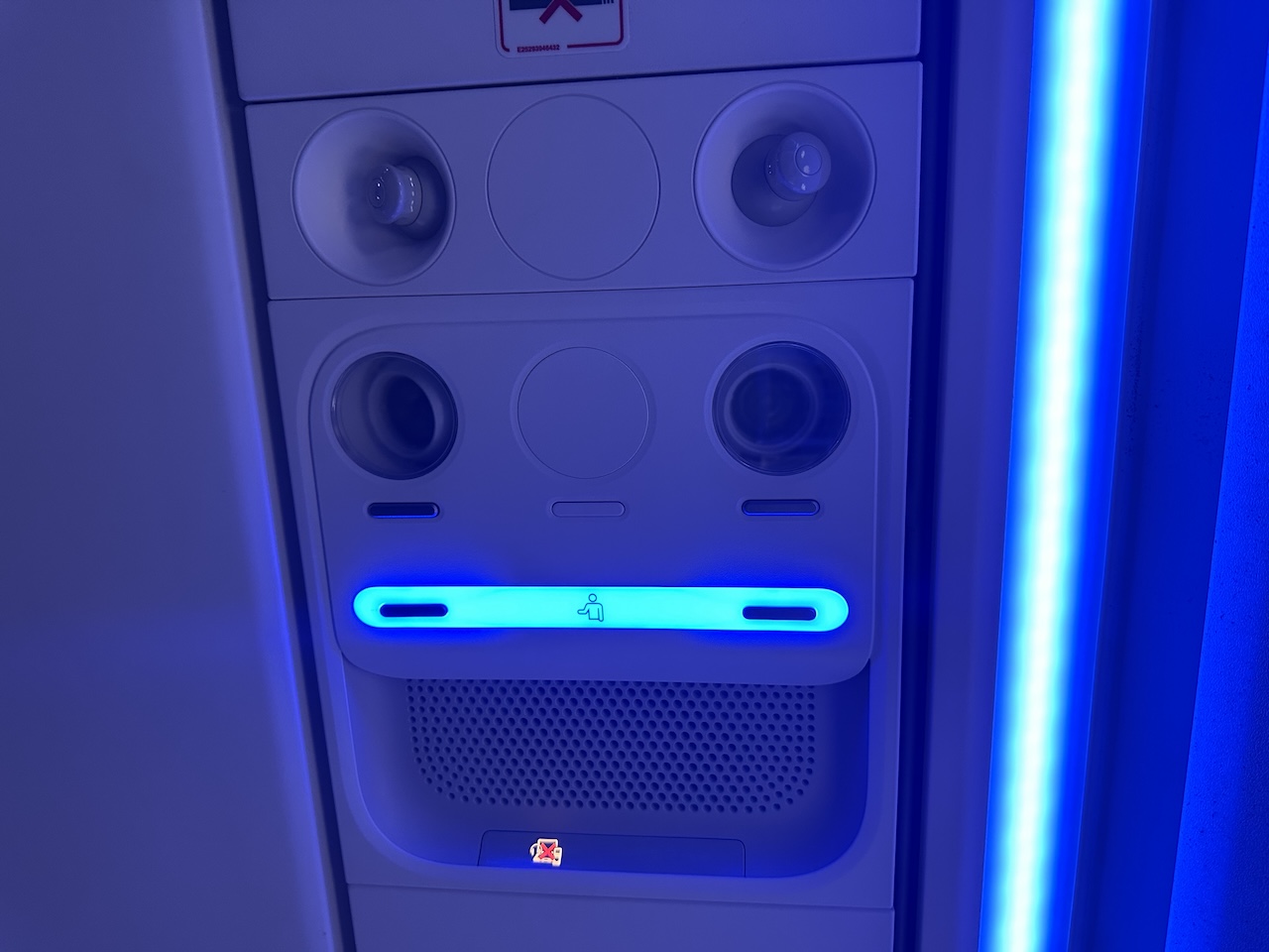 Das Boarding wurde rechtzeitig per Lautsprecher angekündigt, Passagiere der Gruppe 1 durften direkt an Bord. Der Morgen war leider sehr bewölkt und regnerisch, es war also ziemlich dunkel draußen. Das Moodlight in der Kabine war auf blau eingestellt, daher war es vom Licht her zunächst etwas gedämpft.