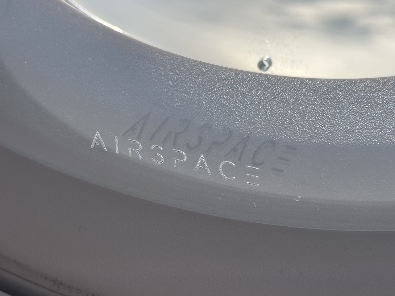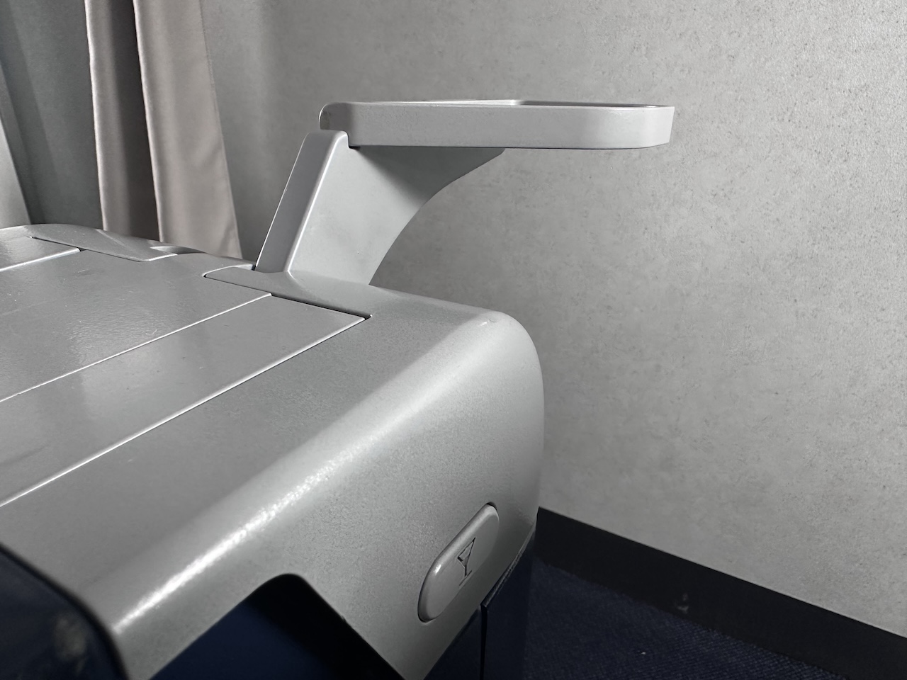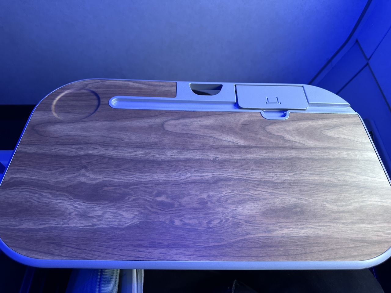 Die Tische sind in Holzoptik und haben auch kleine Ständer für Smartphone bzw. Tablet. Wer nicht den großen Tisch nutzen will, kann den kleineren Cocktailtisch ausklappen. Die Maschinen haben die neue Airspace-Cabin von Airbus, dazu gehören u.a. die großen Ablagefächer, in denen Trolleys auch hochkant gestaut werden können.
