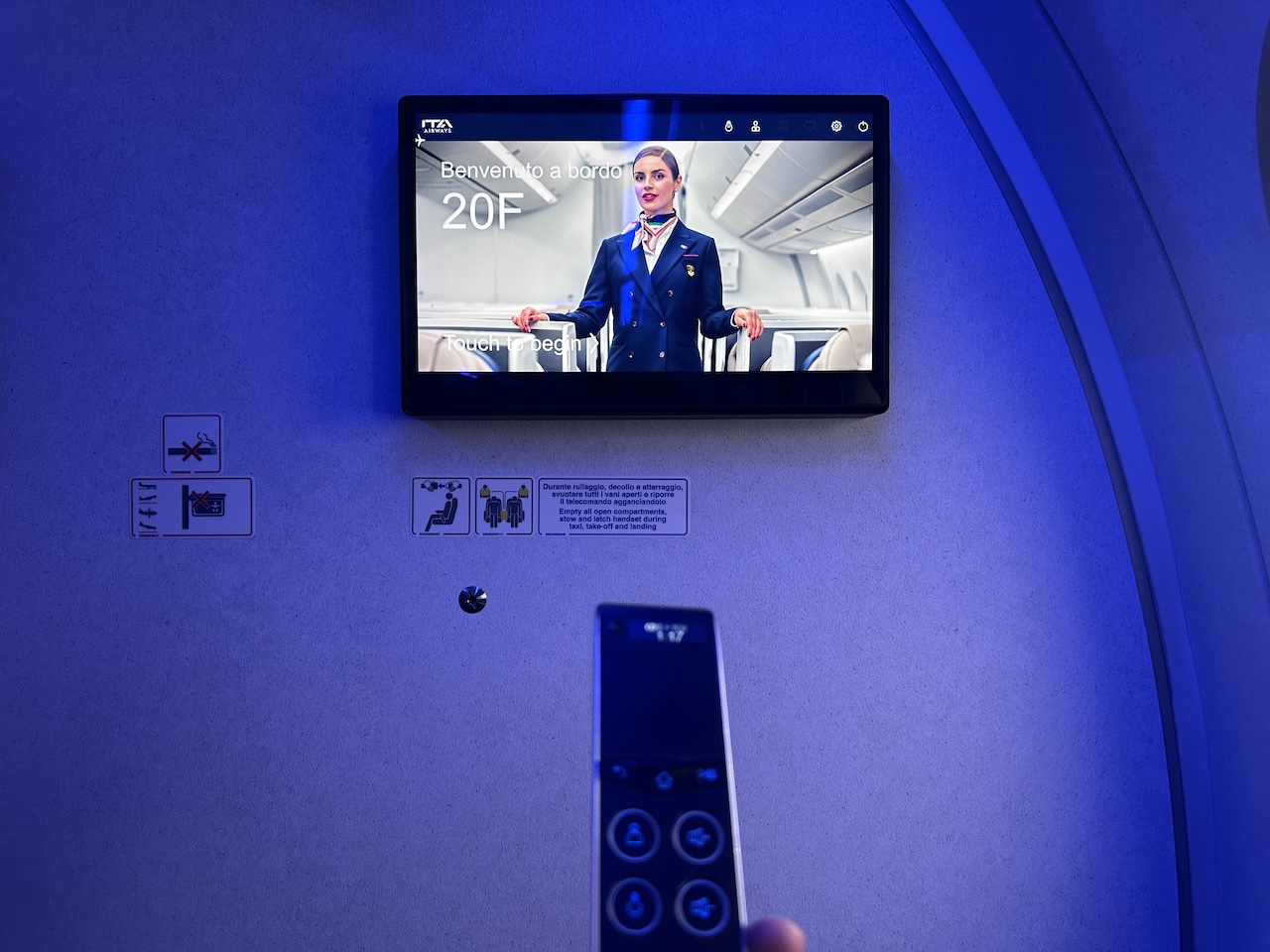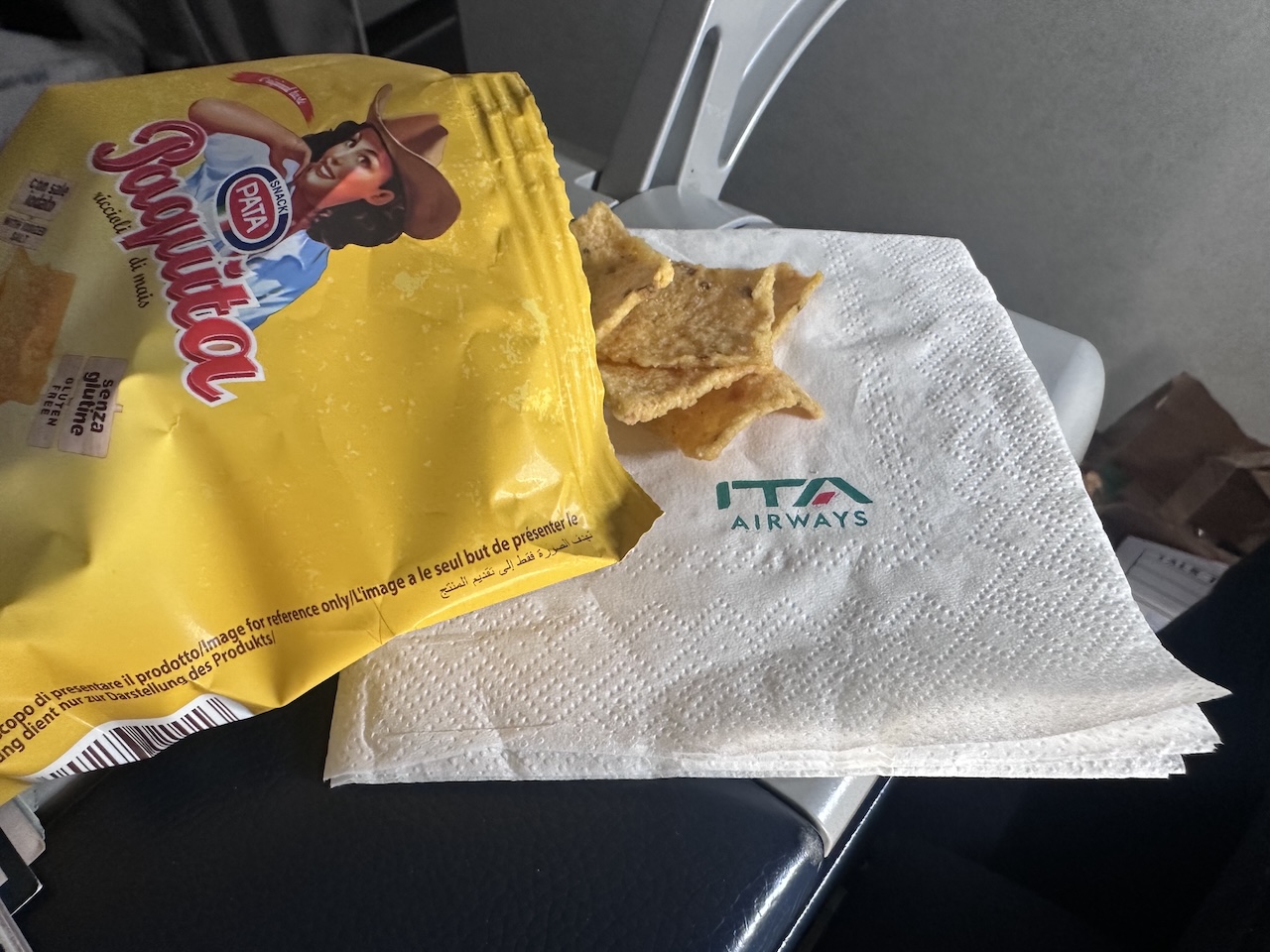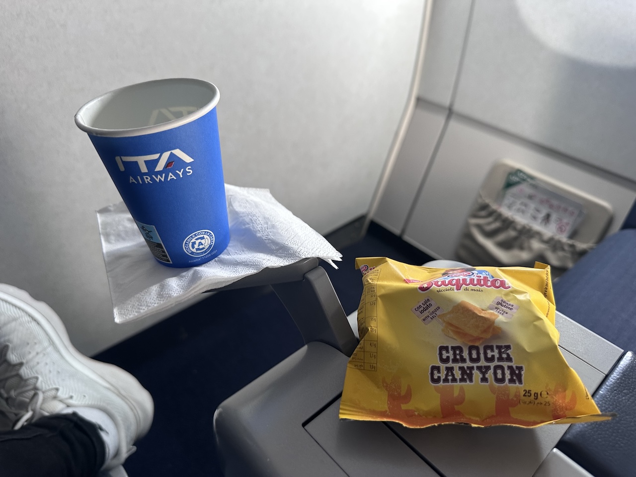 Die Mitglieder der Crew waren etwas ruhiger und fast schon zurückhaltend, nach dem Boarding gab es ein paar Begrüßungsworte per Lautsprecher. Die Sicherheitsvorführung wurde trotz der Monitore an Bord von den Flugbegleiterinnen und Flugbegleitern demonstriert. ITA Airways bietet auf Kurzstrecken einen kostenlosen kleinen Snack an, es gab die Auswahl zwischen einem süßen Riegel und ein paar salzigen Chips.