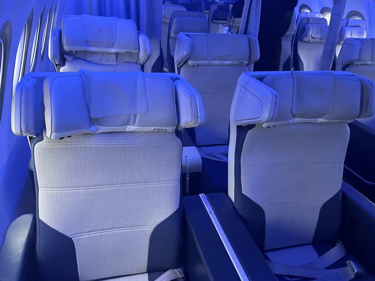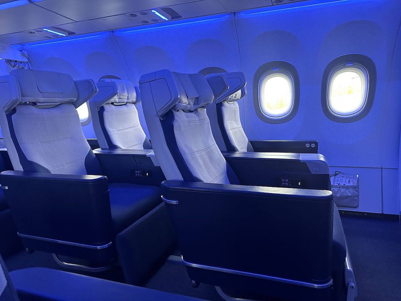 Die Sitze der Premium Economy sind zwischen den anderen beiden Klassen, insgesamt sind 12 Sessel in einer 2-2-Anordnung in drei Reihen verbaut. Die Business Class ist mit einer festen Wand abgetrennt, nach der Premium Class ist ein Vorhang zur regulären Economy.