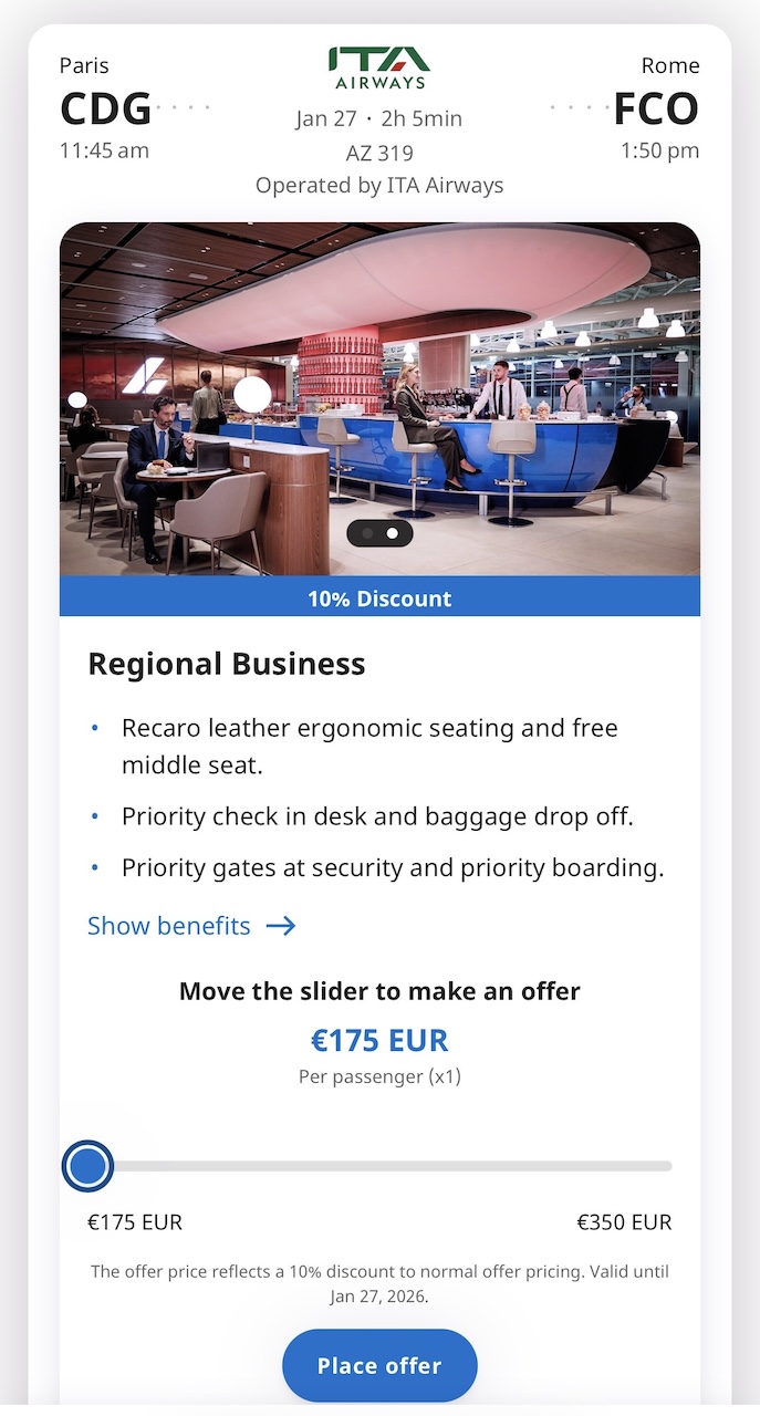 ITA Airways nutzt die Jets vereinzelt auch auf Kurzstrecken, der Airbus A321 LR kommt u.a. regelmäßig zwischen Rom und Paris zum Einsatz. Ich habe einen solchen Flug bei Opodo gebucht und hatte Glück, denn es gab keinen kurzfristigen Aircraft-Change. ITA vermarktet auf der Strecke lediglich Economy- und Business Class, Fluggäste der Holzklasse können sich aber auch Plätze in der Zwischenklasse reservieren oder auch auf ein Upgrade in die Business Class bieten.