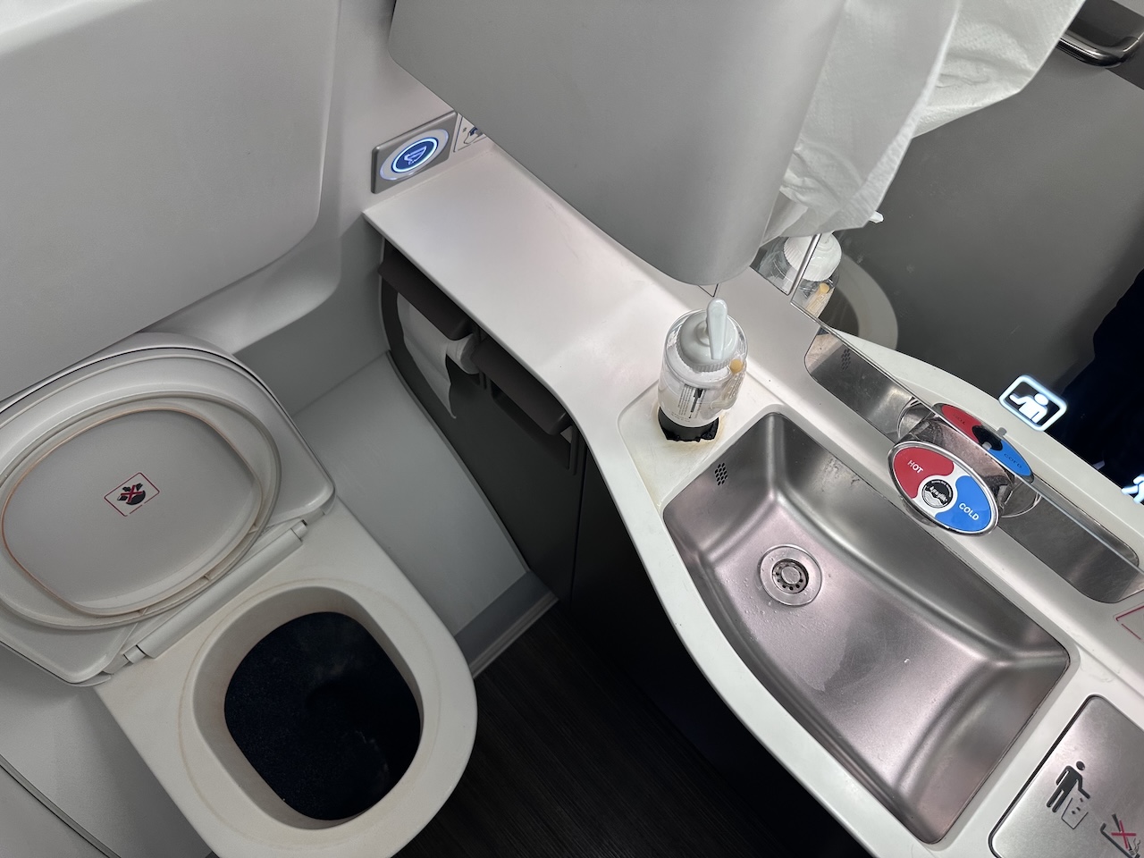 Nachdem ich versorgt wurde, wollte ich die Toilette nutzen. Da die Crew noch in der Economy Class beschäftigt war und im Gang stand, bin ich in die vordere Toilette. Die Purserin warf mir einen so bösen, schon fast vorwurfsvollen Blick zu, dass ich das Gefühl hatte mich erklären zu müssen. Ich fragte, ob es denn okay ist, schnell hier den Waschraum zu nutzen, woraufhin ich ein wortloses Schulterzücken erntete.