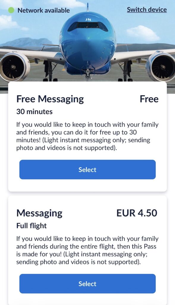 Während des Fluges konnte man sich auch mit dem Internet verbinden, wobei lediglich 30 Minuten Messaging kostenlos angeboten wurden.