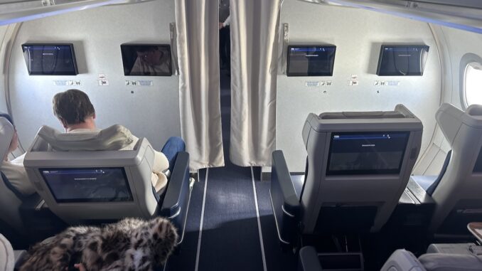 Durch den kleinen Besuch der vorderen Lavatory konnte ich dann noch ein paar Eindrücke von der Kabine sammeln und Bilder bei Sonnenlicht anfertigen. Zunächst die Business Class-Sitze, die in einer großzügigen 1-1-Anordnung verbaut wurden: