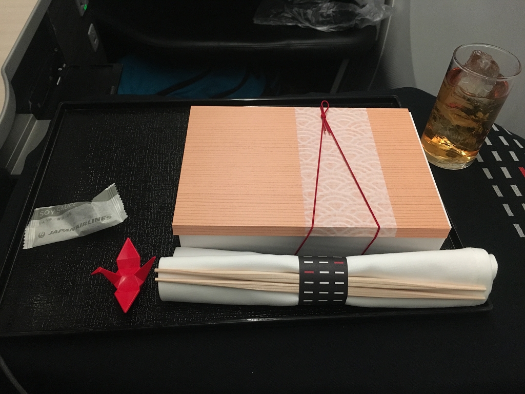 Die Purserin kam vorbei, baute sich in dem kleinen Gang zum Gang auf und ließ mich mit ernstem Blick wissen, dass sie die Purserin sei und für den Service bei mir nur die Crew zuständig sei. Die für mich zuständige Cabin Attendant schien mich sehr mit „spitzen Fingern“ zu behandeln. Die Interaktion war auf ein Minimum beschränkt. Ein Beispiel: Ich bestellte Shochu und fragte, welcher von der Karte wie schmecken würde. Darauf zeigte die Cabin Attendant auf einen, sagte „This“ und verschwand. 30 Sekunden später war sie mit einem randvoll gefüllten Wasserglas mit Shuchu drin wieder da. Nur, was sollte ich mit einem vollen Glas Shochu? Immerhin hat das gute Getränk ca. 20% Alkohol gehabt.