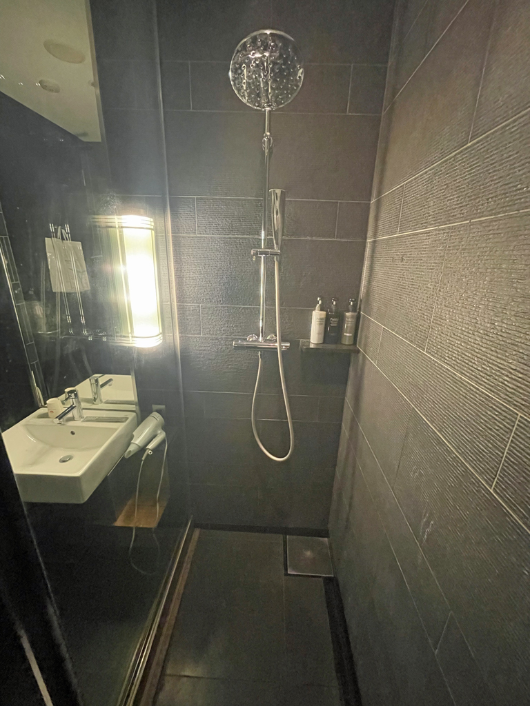 Wenn man die Benachrichtigung von der App erhält, dass die Dusche frei ist, hat man wenige Minuten Zeit. Um sich an der Rezeption zu melden. Dann geht es in Begleitung in der Duschbereich und eine Duschkabine wird einem aufgeschlossen. Dann betritt man einen Raum, der bis zur Decke mit anthrazitfarbenen Fliesen bedeckt ist und dadurch fast deprimierend dunkel wirkt. Pflegeprodukte erhält man aus großen Spenderflaschen.