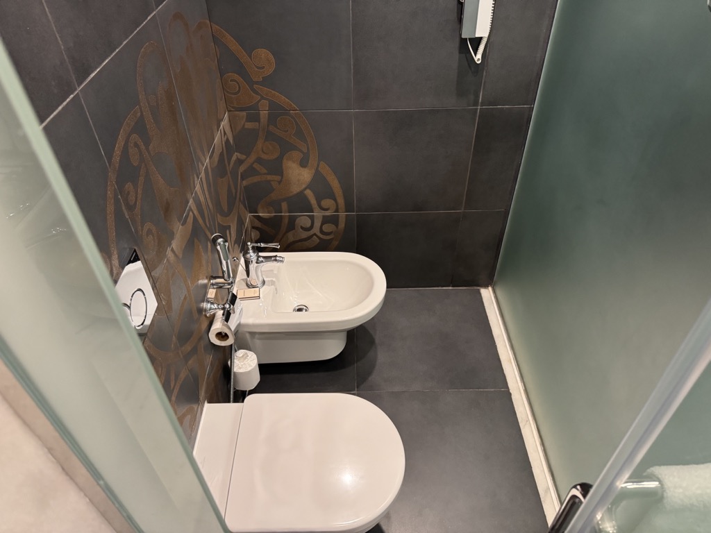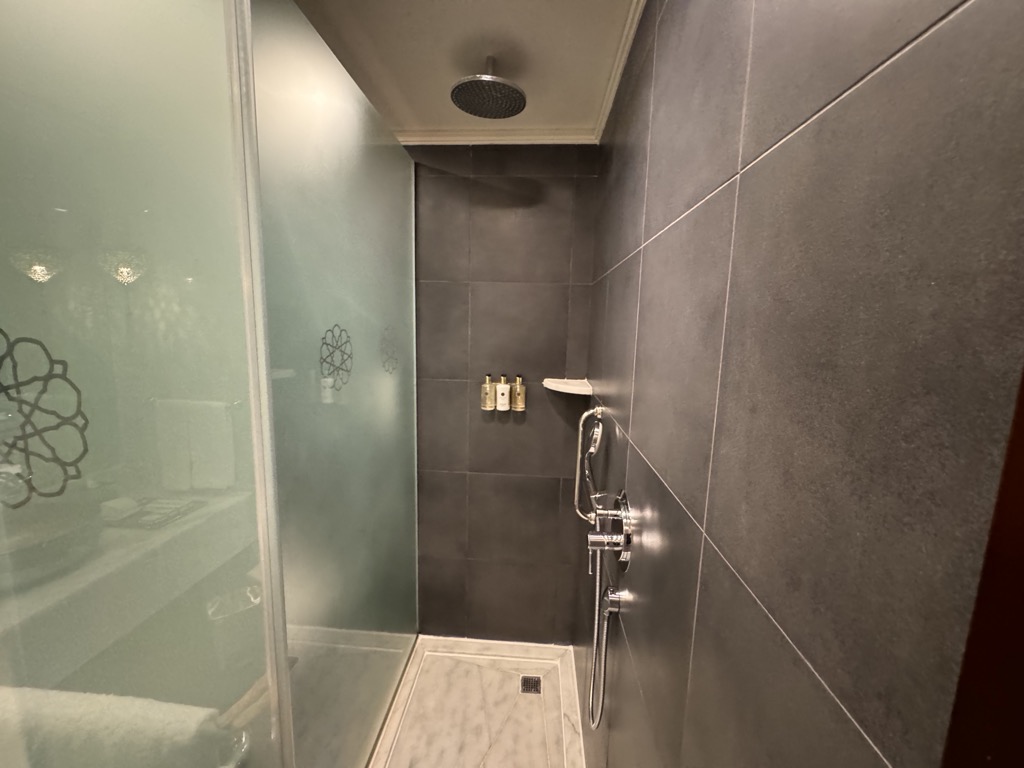Direkt hinter der Zimmertür tritt man in einen kleinen Flur, von dem rechter Hand das Badezimmer, mit großer steinerner Badewanne, einer begehbaren Dusche und einer abgetrennten Toilette befand. Hier lagen auch bereits reichlich Amenities bereit.
