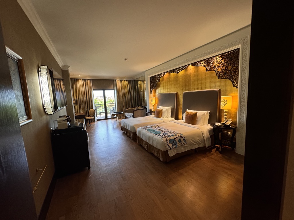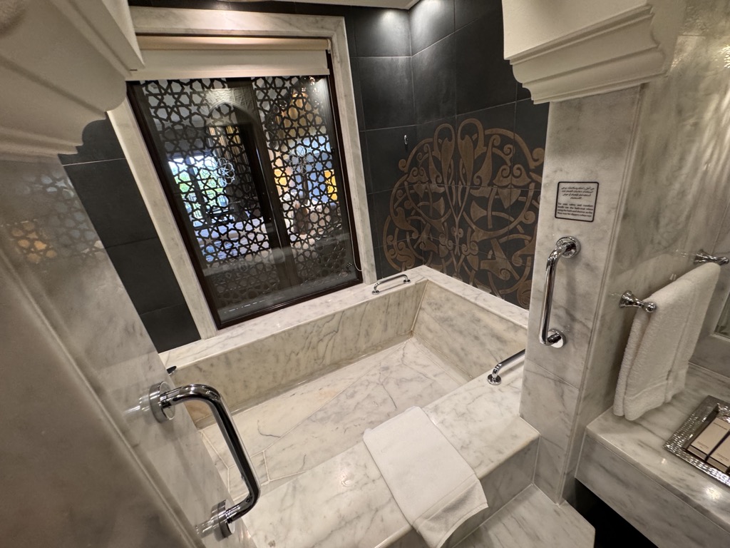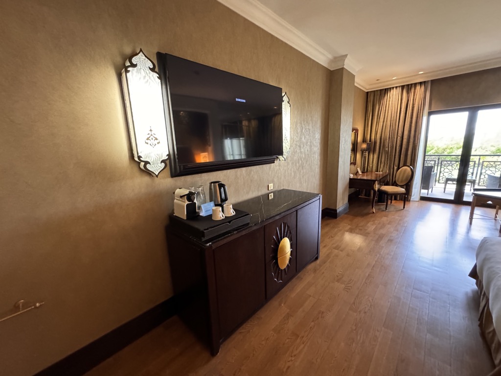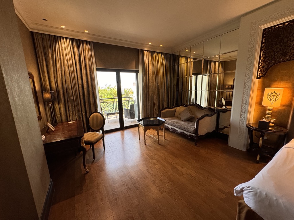 Vor der Fensterfront befand sich noch eine gemütliche Sitzgruppe mit Schreibtisch, an dem wir auch etwas gearbeitet haben. Das Zimmer rundet ein Balkon mit schöner Aussicht und Sitzgelegenheit ab. Hier hätte ich mich noch über Sitzpolster auf den Sitzen gefreut. Das Zimmer ist nicht super modern und clean gestaltet, das ist aber auch gar nicht das Design-Thema des Hotels. Der arabische Stil ist aber, wie sonst oft nicht, hier sehr geschmackvoll gewählt. Das Zimmer war tadellos sauber und in gutem Zustand.