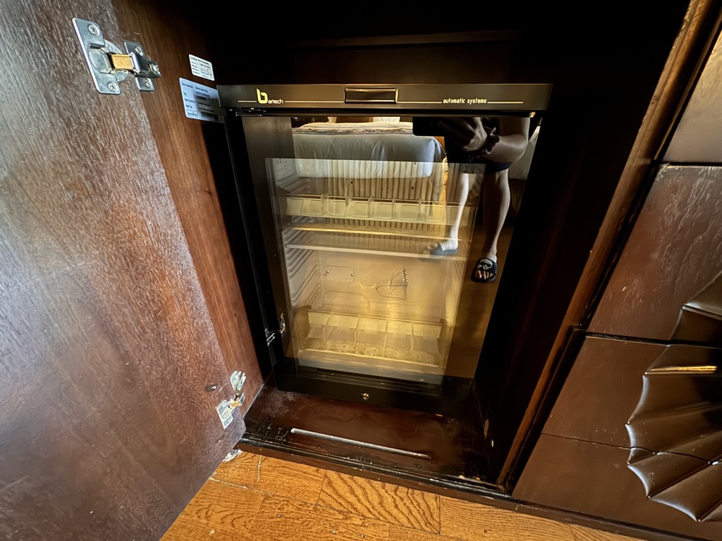 Gegenüber des Badezimmers ist der Schrank, eine Kommode und die Minibar verbaut. Hinter dem kleinen Flur steht man bereits im Schlafbereich. Hier waren natürlich die Betten das zentrale Element, wie auch der gegenüberliegende Fernseher.
