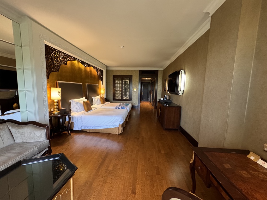 Im Zimmer angekommen wurden wir erst einmal von der Größe überrascht. Trotz der zwei Queenbetten hatten wir noch super viel Platz, sogar die zwei Kinderbetten, die kurz nach unserer Ankunft geliefert wurden, standen nicht im Weg – aber der Reihe nach.