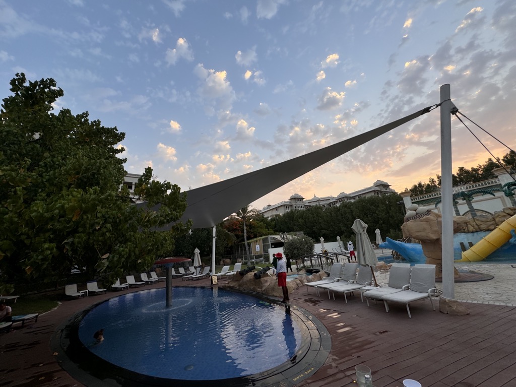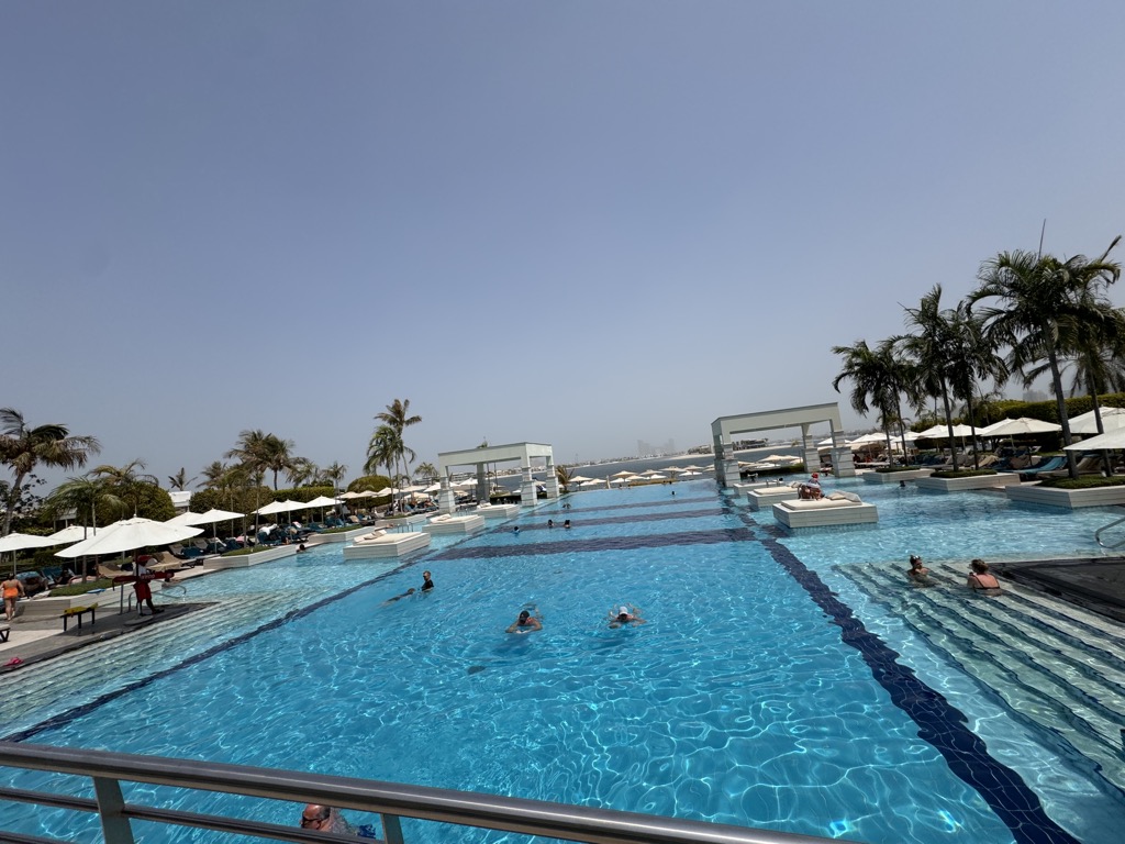 Das Jumeirah Zabeel Saray hat mehrere Pools, die sich an unterschiedlichen Bereichen des Hotels befinden. Sehr zentral ist der große Pool, der sich direkt hinter der Lobby befindet. Hier könnt Ihr in verschiedenen Cabanas oder auf Liegen ruhen und es stehen auch viele Sonnenschirme zur Verfügung. Alleine aufgrund der Größe kommt man sich hier nicht so leicht in die Quere.