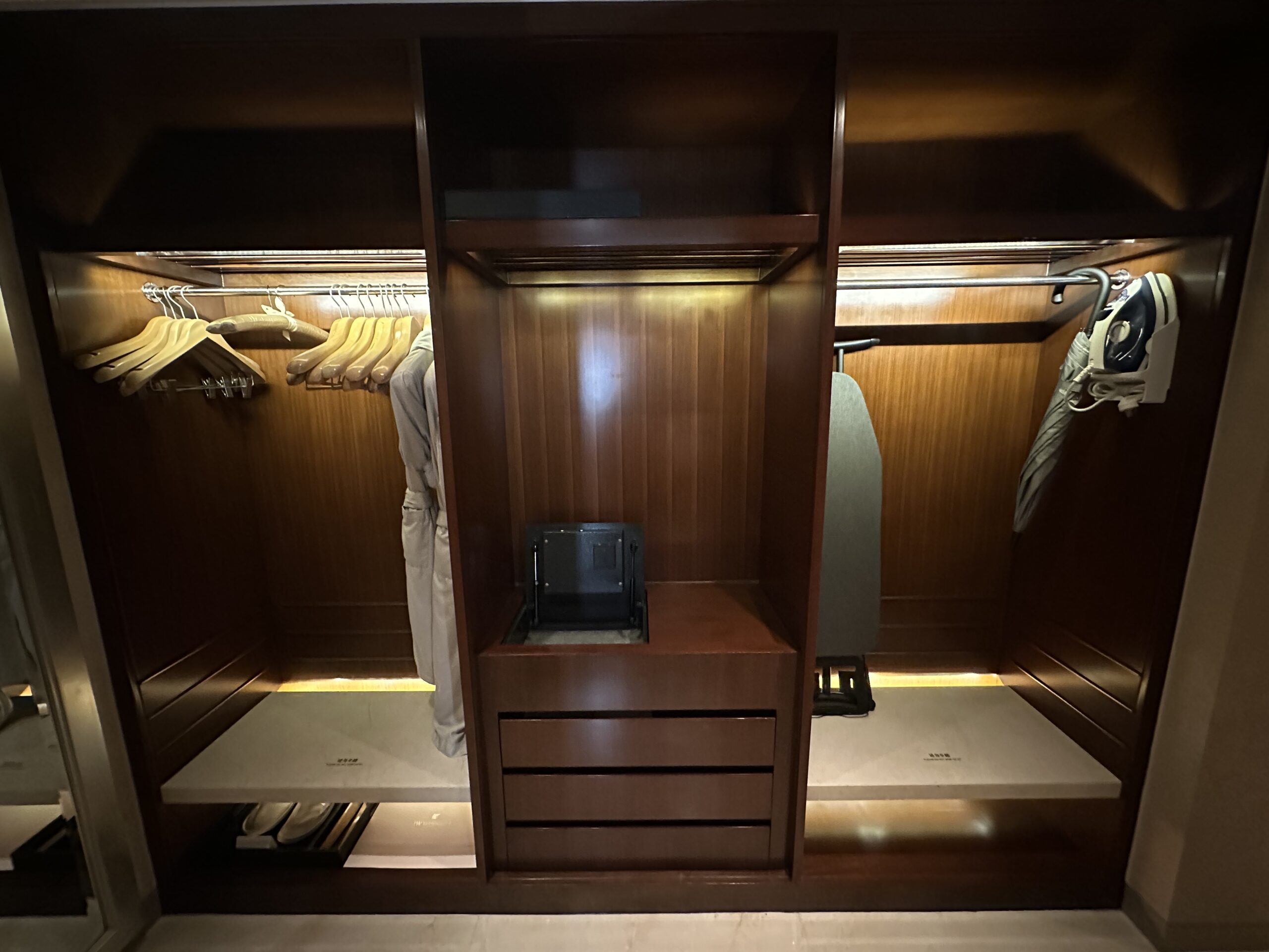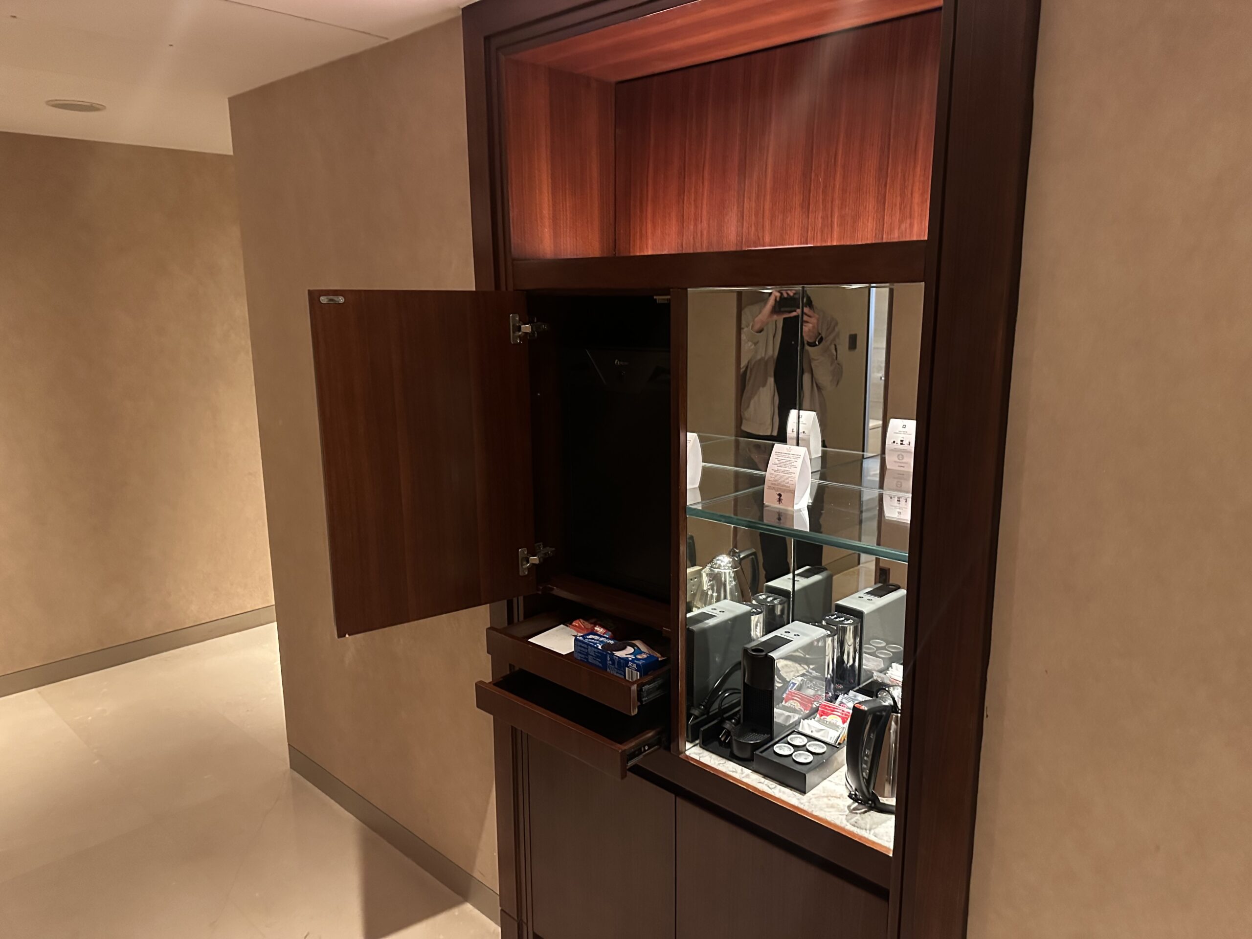Der Flur führte zu einem größeren Kleiderschrank. Hier waren zudem Minibar, Espressomaschine und Safe installiert.