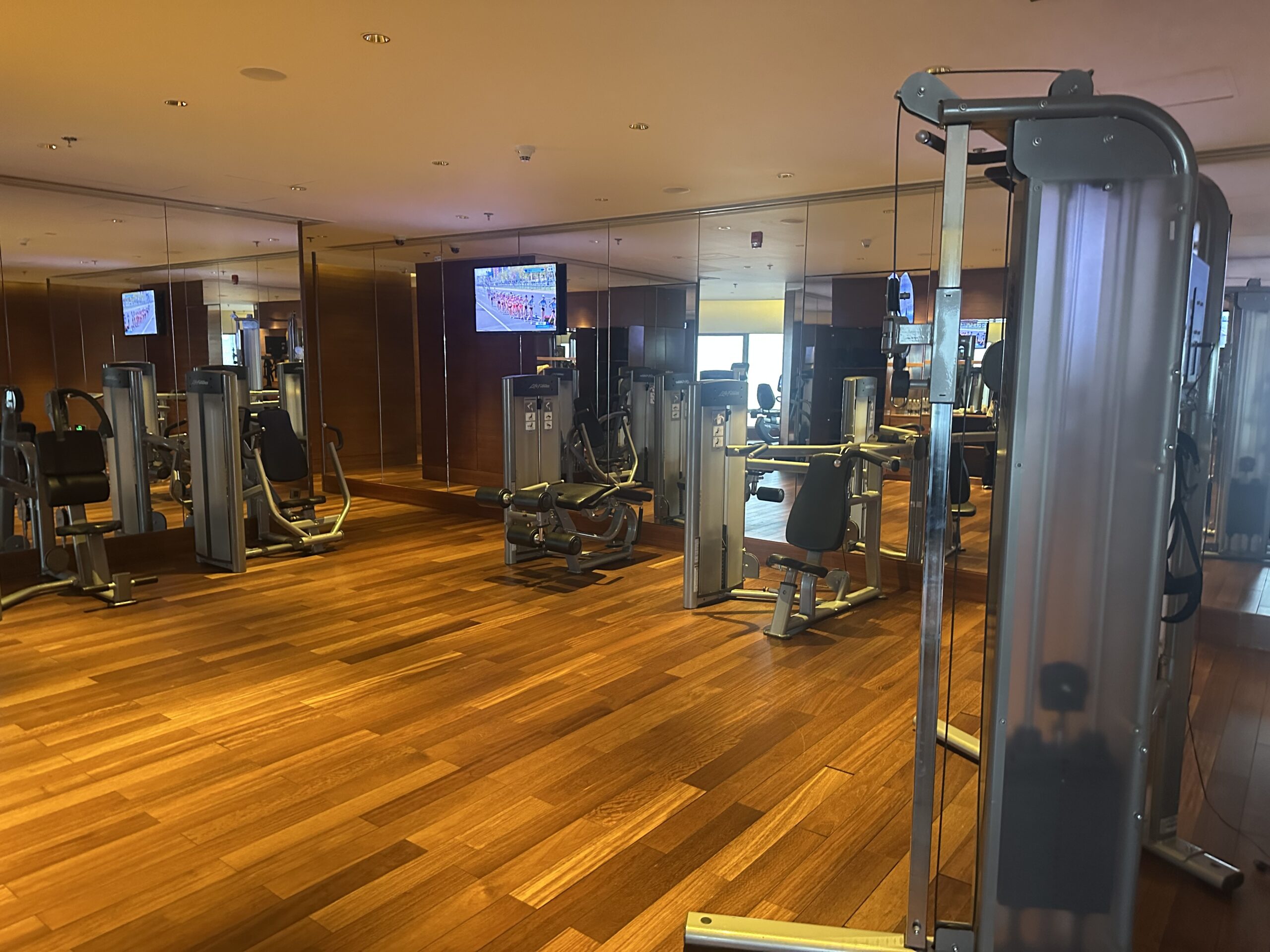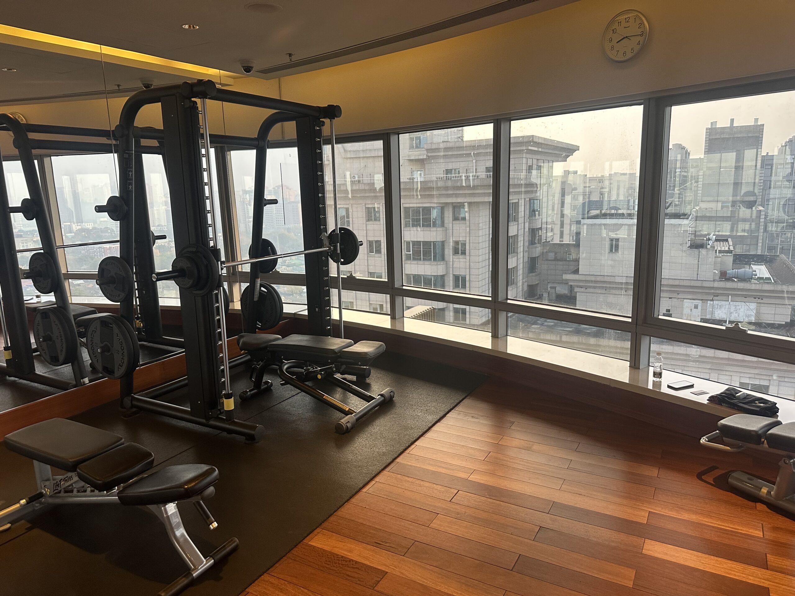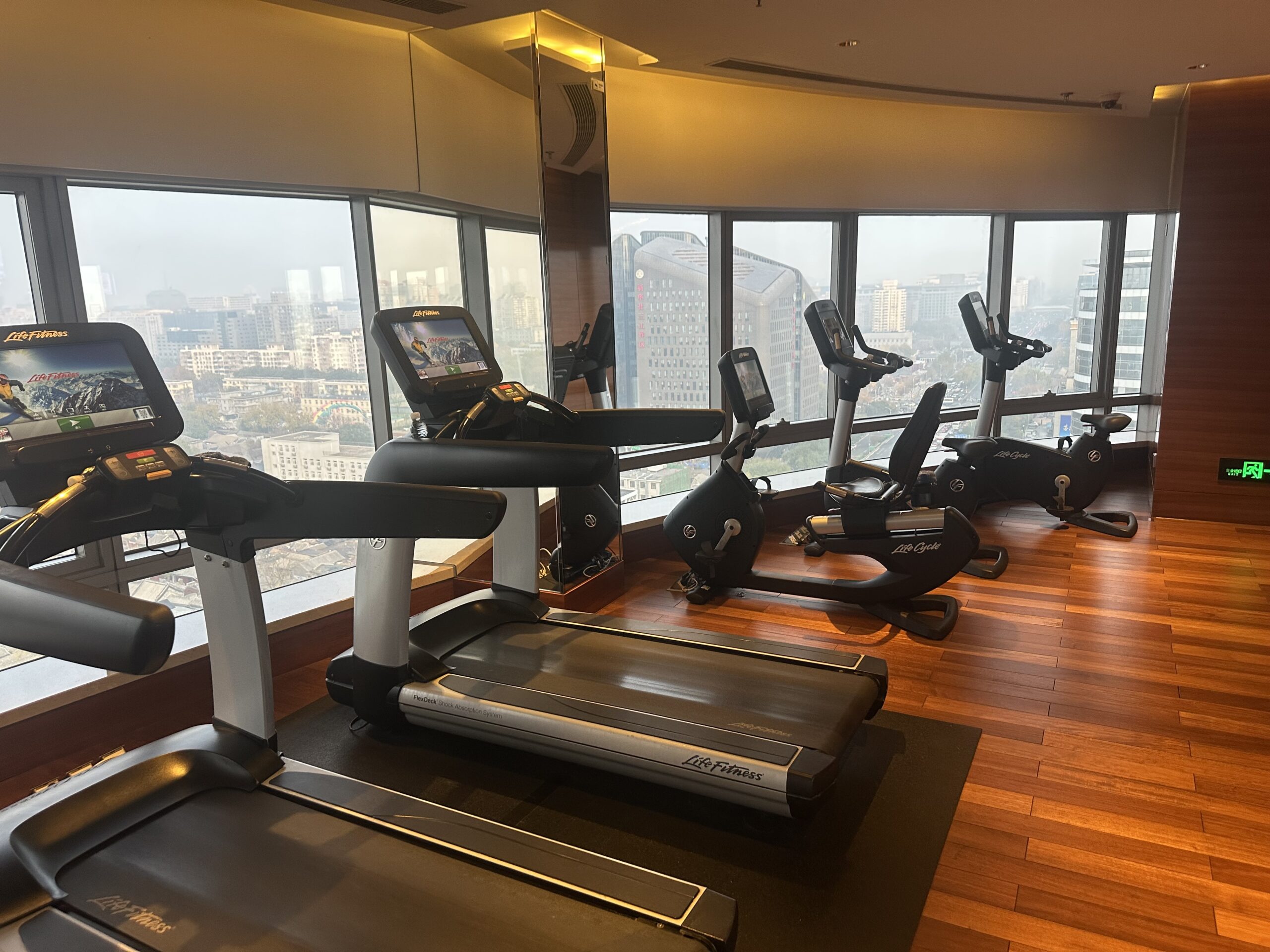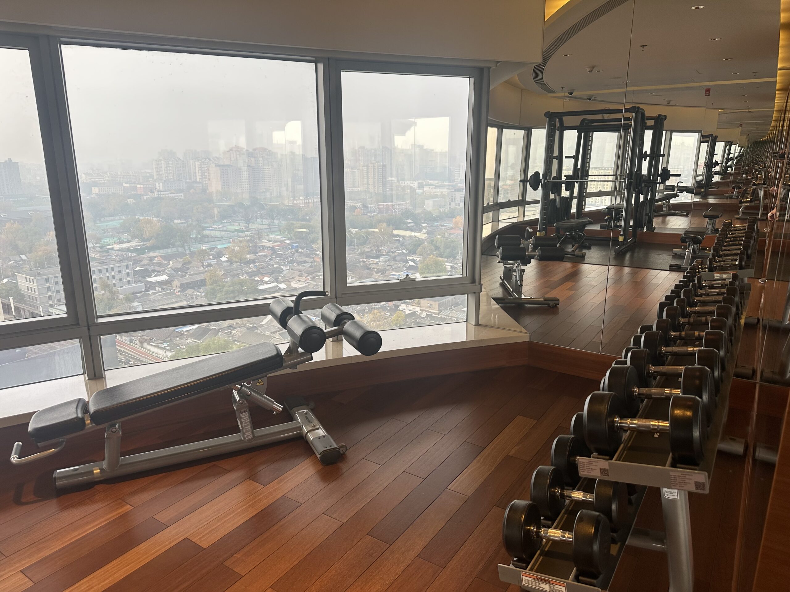 Oft sind Fitnessstudios im Keller oder Erdgeschoss, dort muss man auf eine entsprechende Aussicht verzichten. Im JW Marriott Peking darf man trainieren und gleichzeitig vom 19. Stock auf die Stadt schauen, wenn man aber mit Gewichten hantiert oder auf dem Laufband ist, bekommen es die Gäste in der Suite darunter voll mit… Nicht gerade durchdacht.