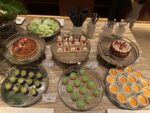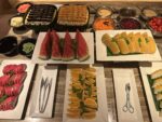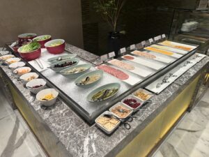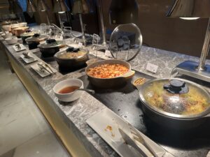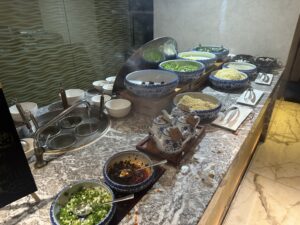 Das Buffet ist für eine Lounge ziemlich groß, im Angebot waren Vorspeisen, Sushi, Salate und diverse warme Hauptgänge und Desserts.