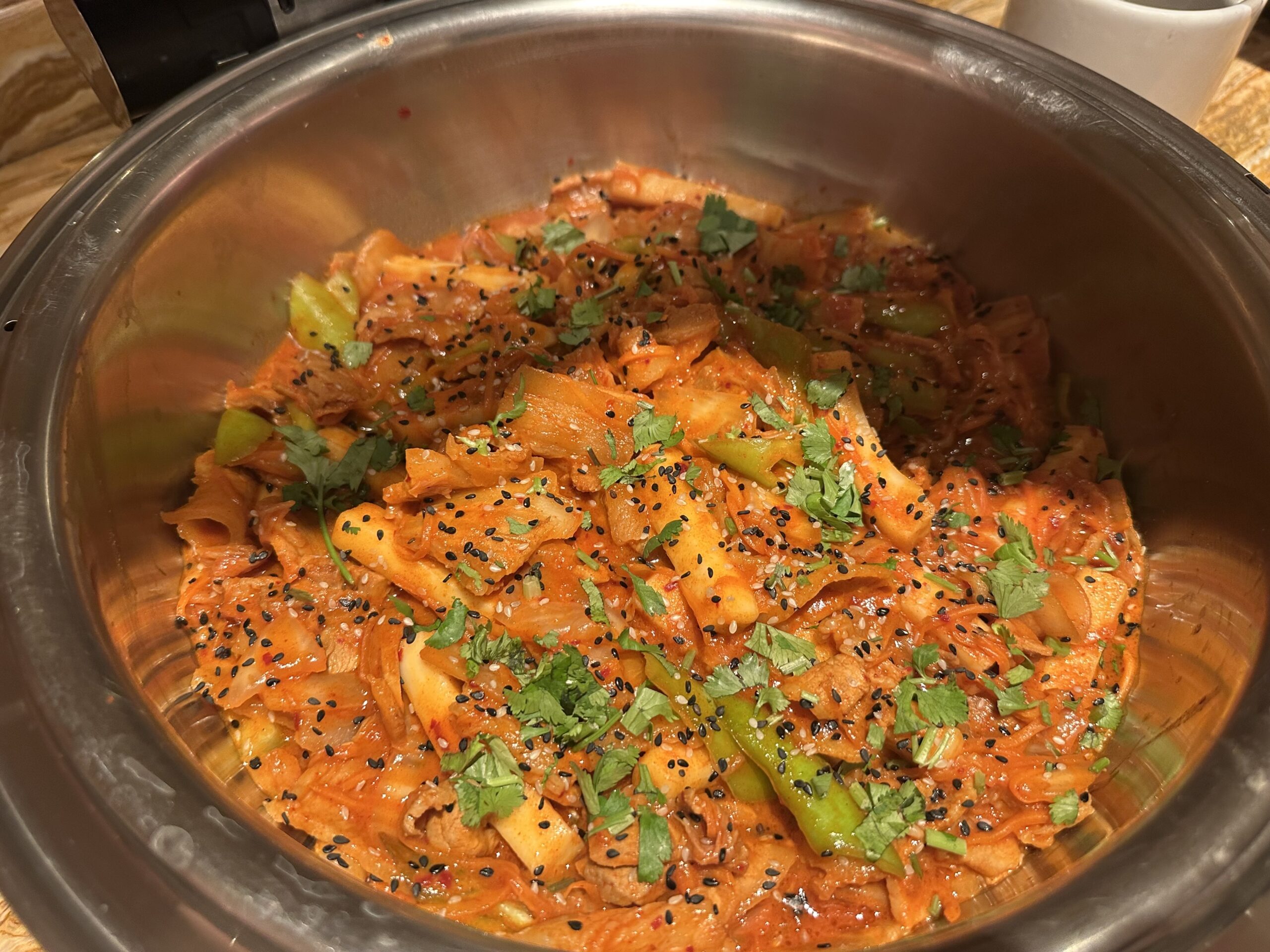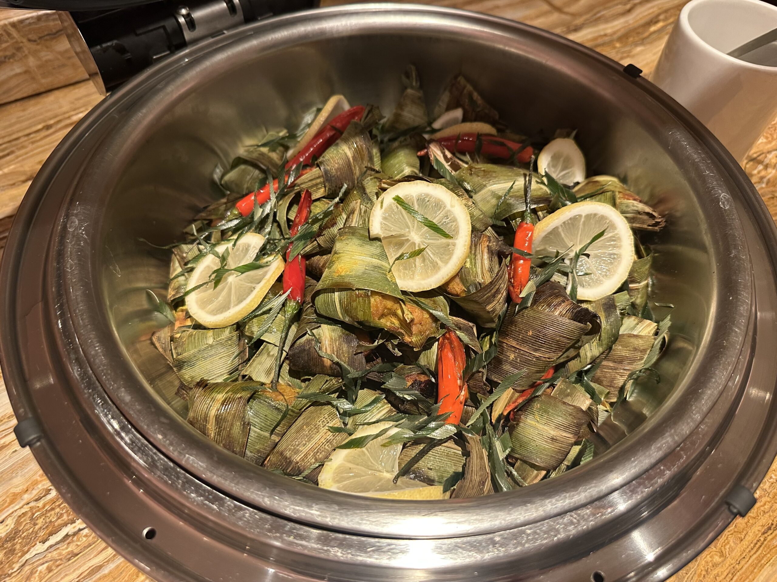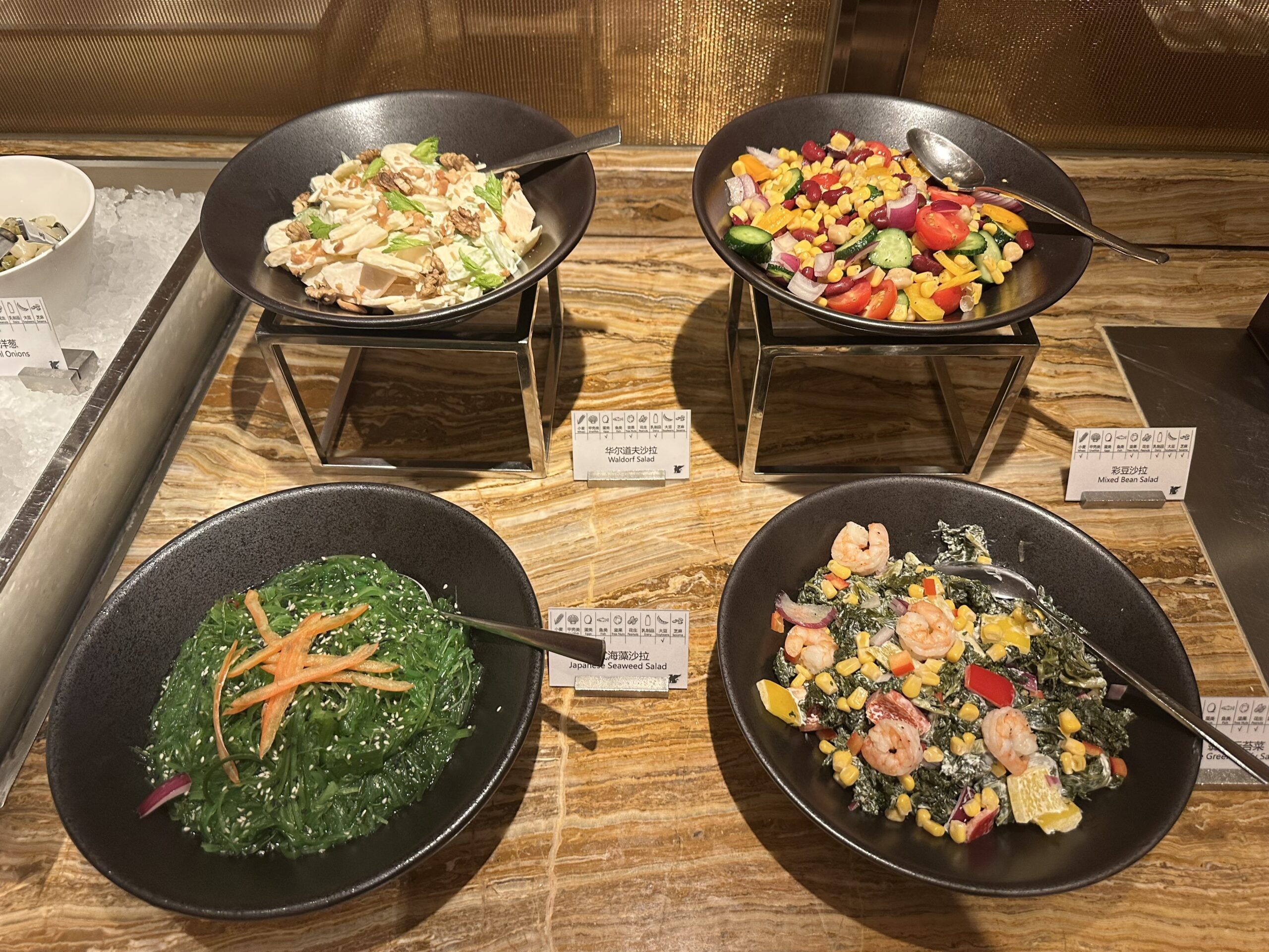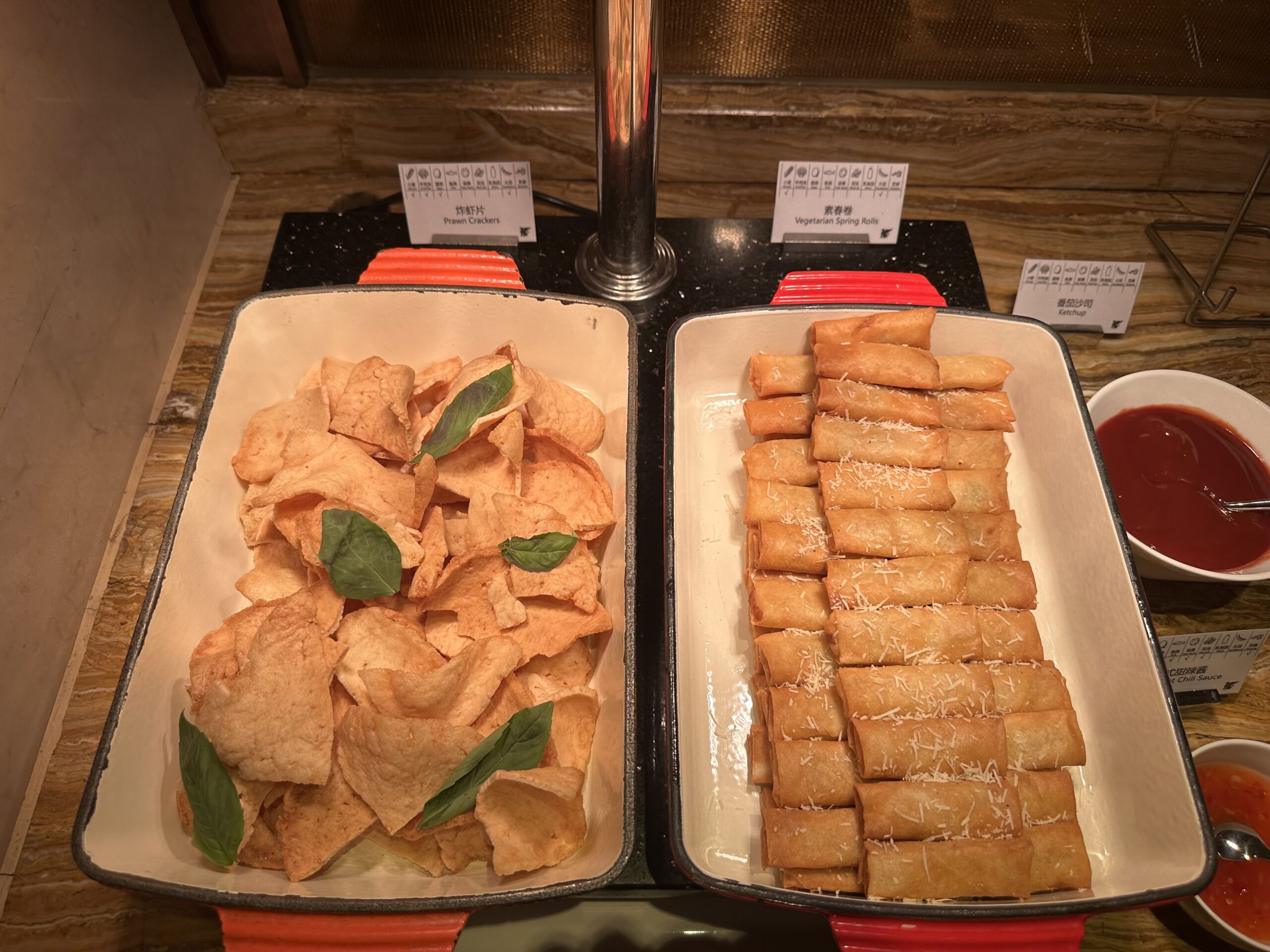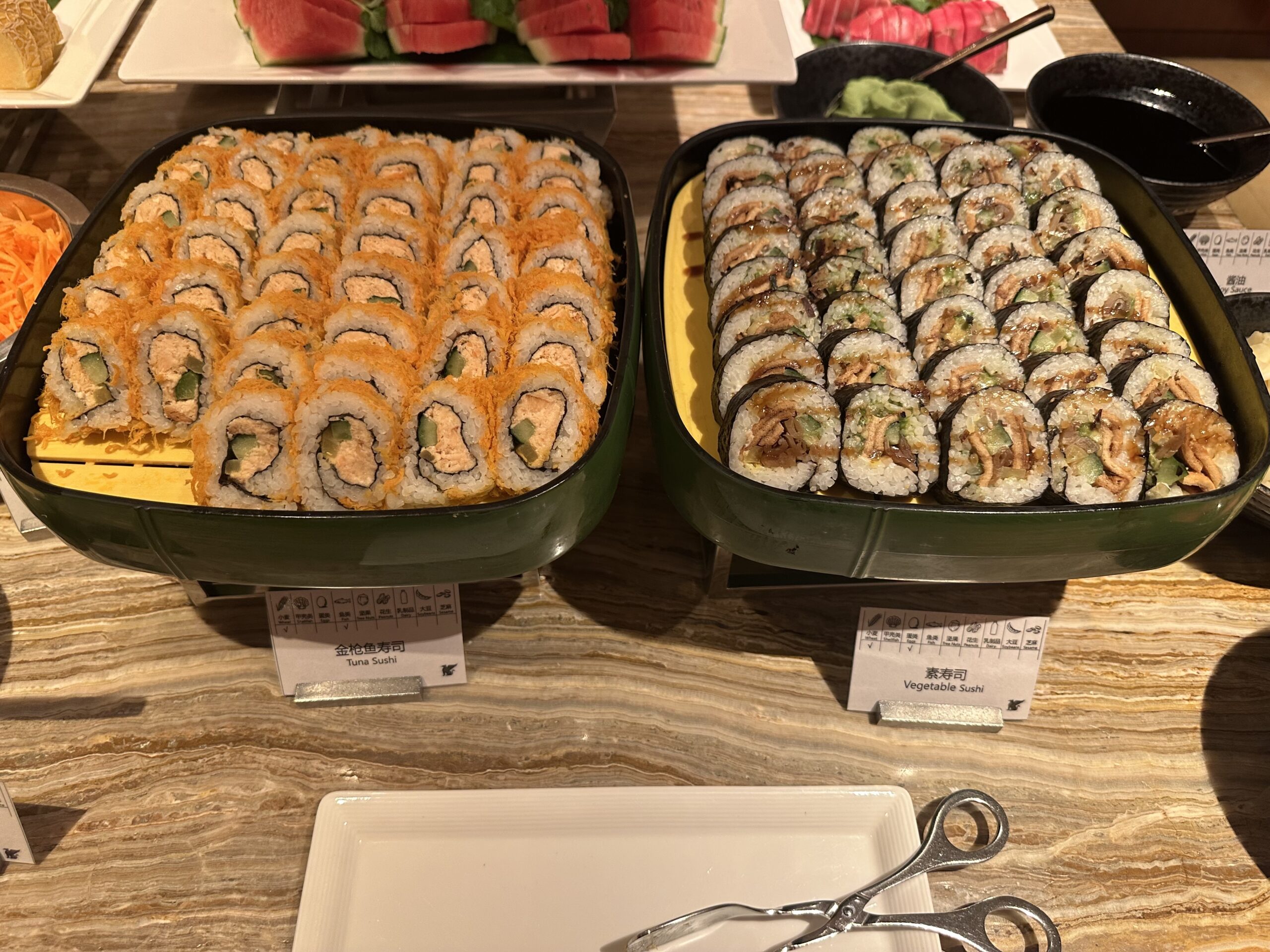 Das Buffet ist für eine Lounge ziemlich groß, im Angebot waren Vorspeisen, Sushi, Salate und diverse warme Hauptgänge und Desserts.
