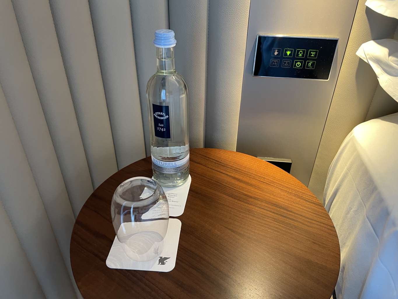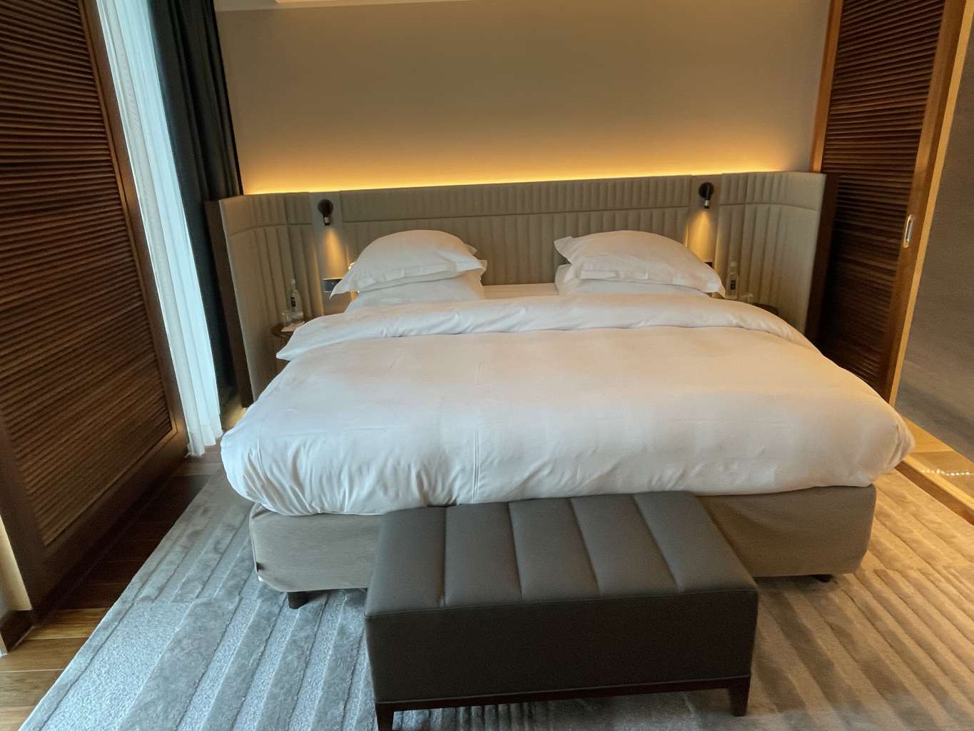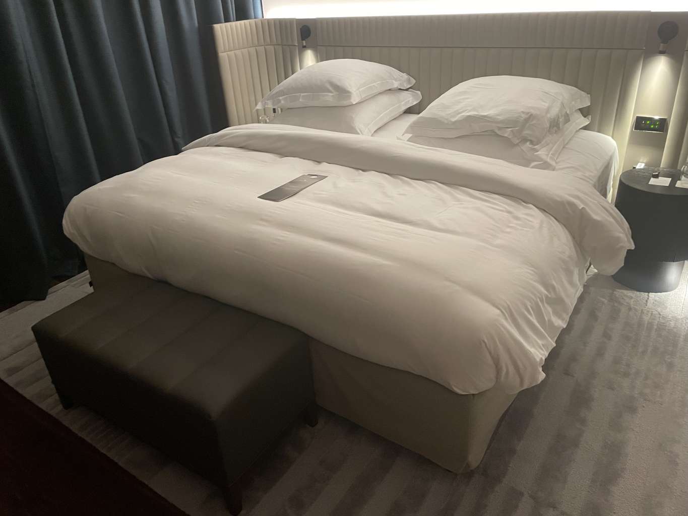 Im Schlafbereich dominiert natürlich das große Bett mit den riesigen Kissen, die einen wirklich guten Schlaf bieten. Neben dem Bett stehen zwei Nachttisch-Kommoden, auf denen jeweils eine stille Flasche Wasser stand. Von dort lassen sich alle relevanten Beleuchtungen steuern und per Knopfdruck die Zimmer verdunkeln. Neben dem Bett sind ausreichend Steckdosen vorhanden, so dass über Nacht auch mehrere Geräte in Reichweite geladen werden können.
