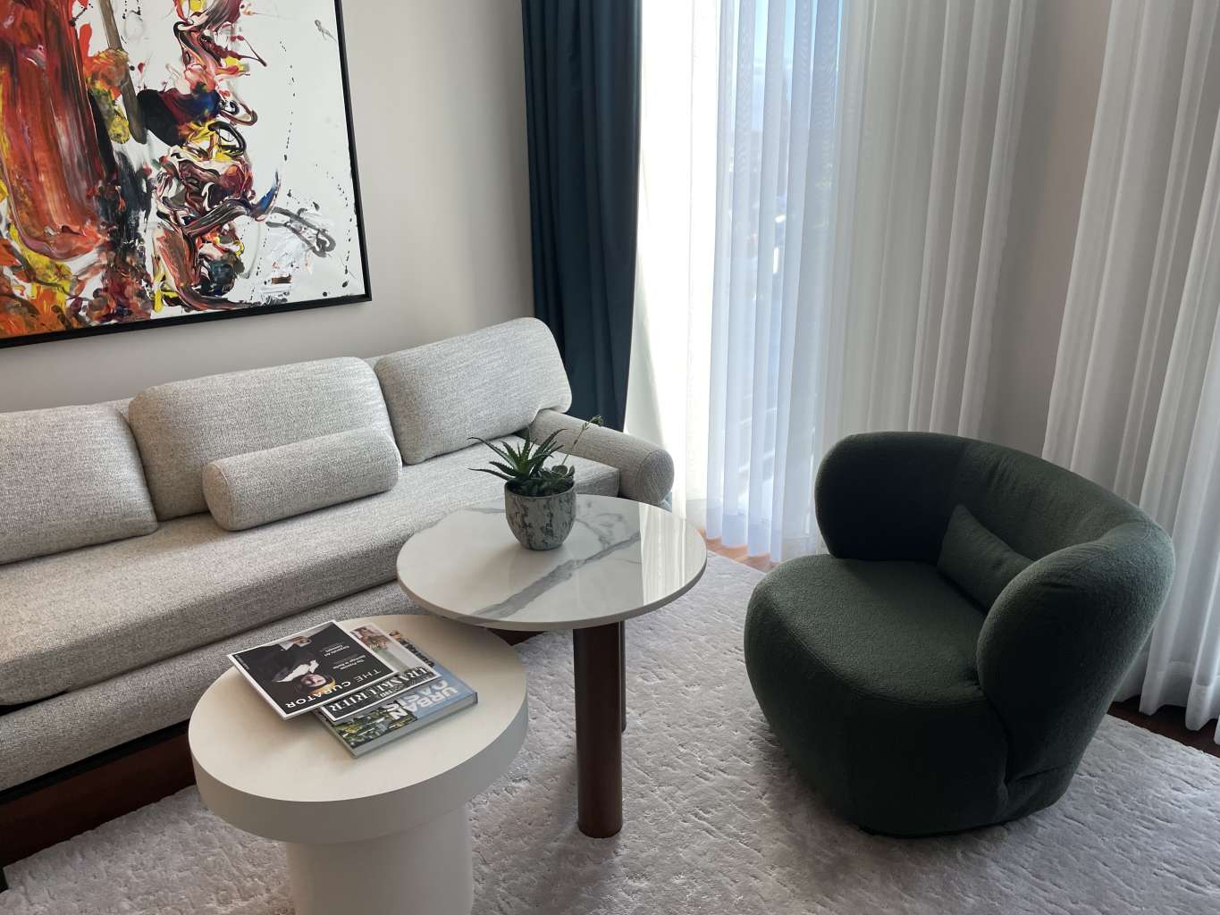 Wie eine klassische Junior Suite so gebaut ist, sind Wohnbereich und Schlafbereich keine separaten Räume. Das Zimmer ist allerdings so gestaltet, dass beide Bereiche als eigenständige Räume wahrgenommen werden. Das erreicht das Hotel durch einen Raumteiler, der gleichzeitig auch die Minibar beherbergt sowie einer drehbaren Säule, an welcher der Flachbildfernseher montiert ist. Außerdem steht auf dem Möbelstück noch die Kaffeemaschine.