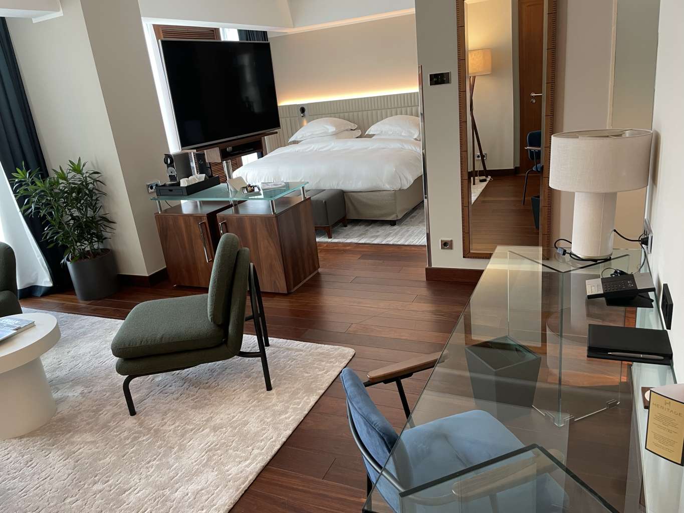 Gebucht hatte ich im JW Marriott Frankfurt einen Deluxe-Room. Vermutlich dank der Kombination aus Marriott Bonvoy Platin Elite und Frankfurtflyer Hotels Vorteilen gab es ein Upgrade in eine Junior Suite.