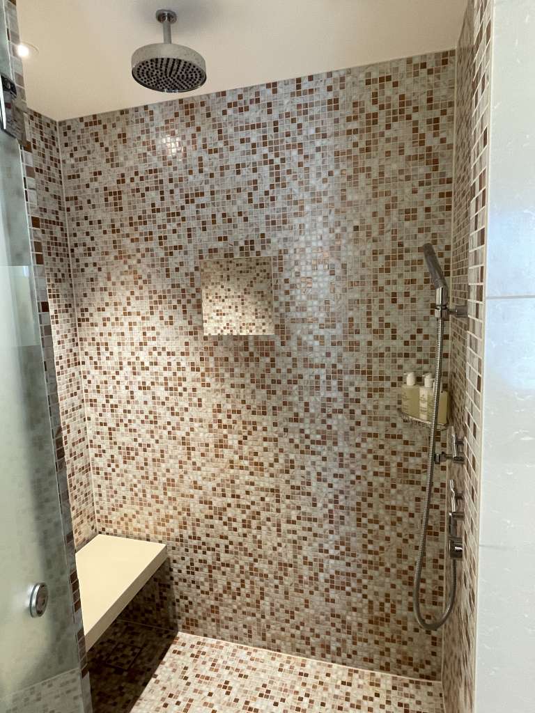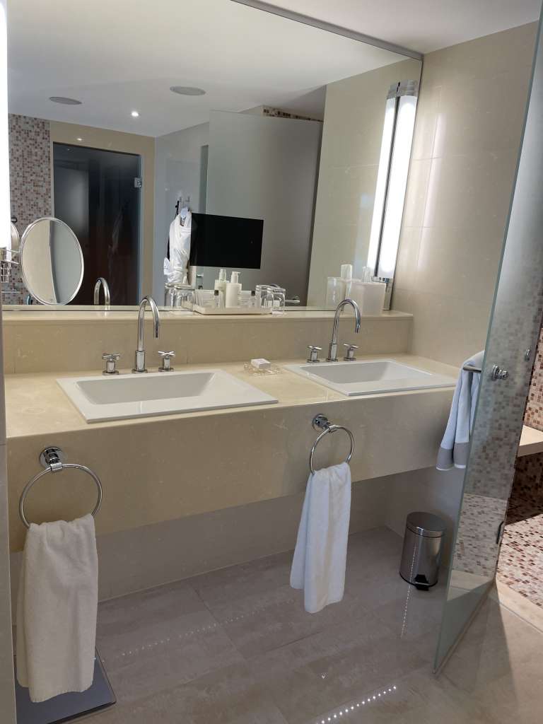 Die Badewanne und der doppelte Waschtisch befinden sich in einem zur Suite offenen Teil des Badezimmers. Hinter einer Glastür befindet sich die sehr großzügige Dusche und hinter einer zweiten WC und Bidet. Und wer meine Reviews regelmäßig liest, weiß dass mich ein Hotel mit diesem geringfügigen Zivilisations-Upgrade eines Bidets schon auf seine Seite gezogen hat.