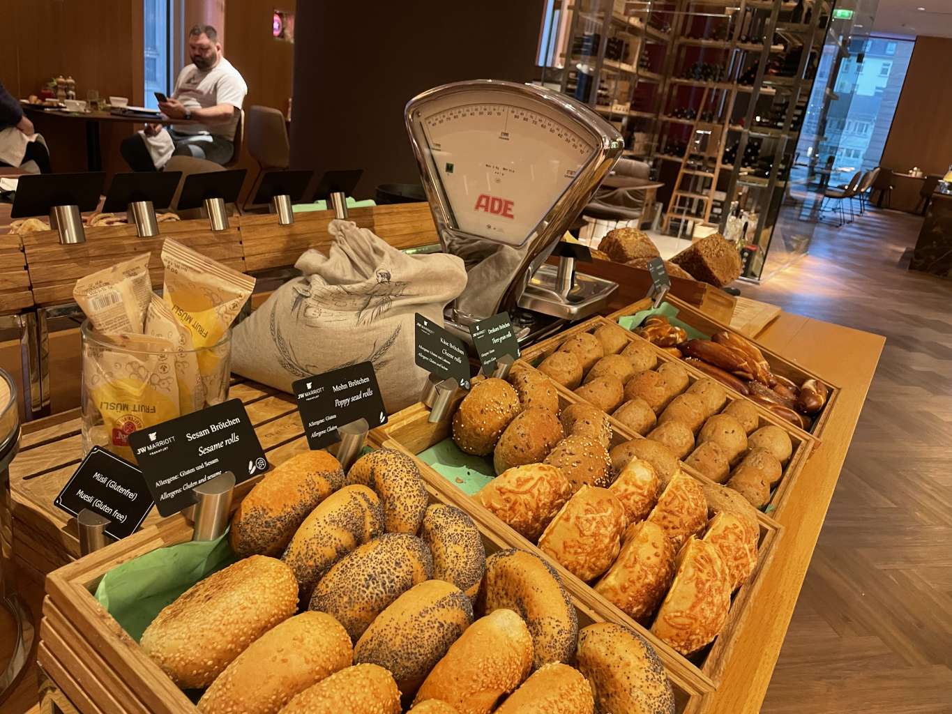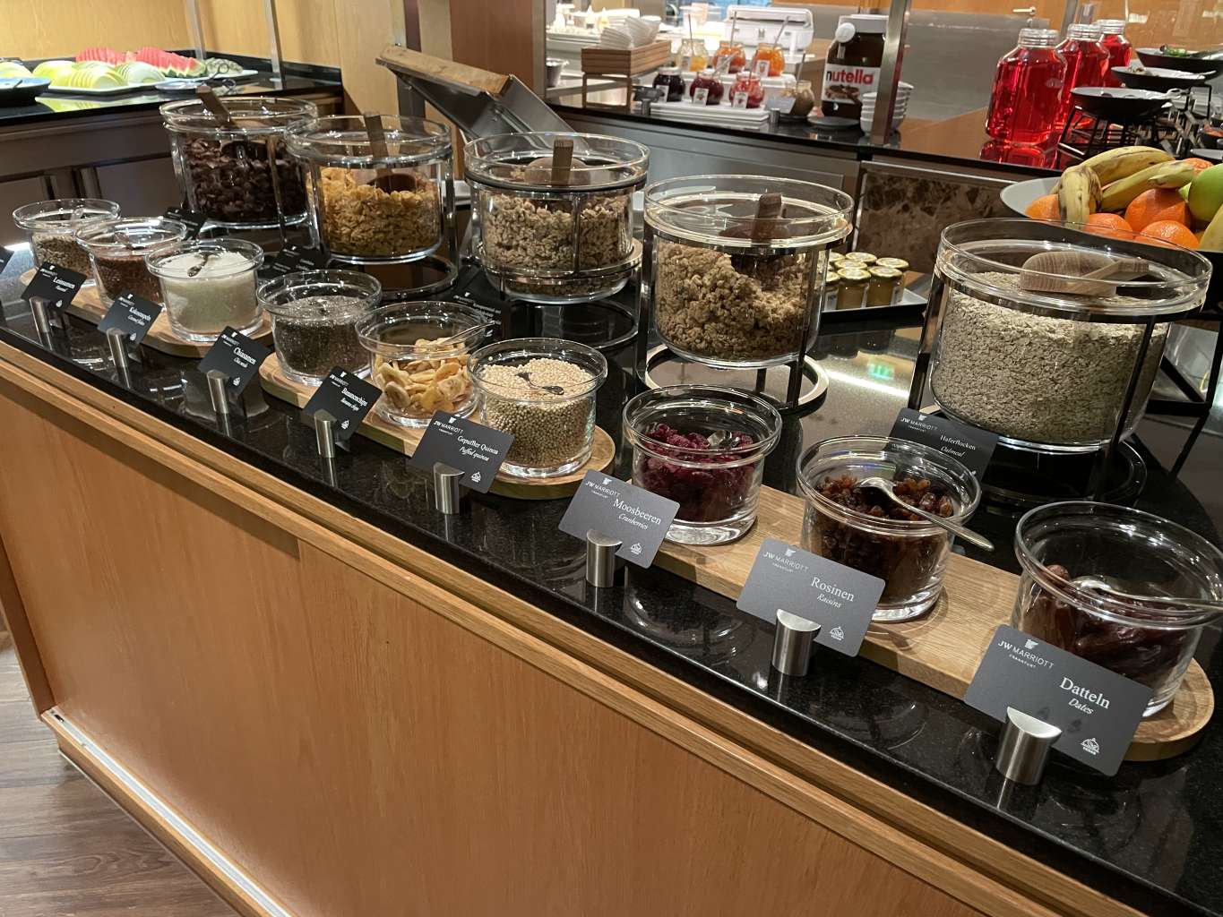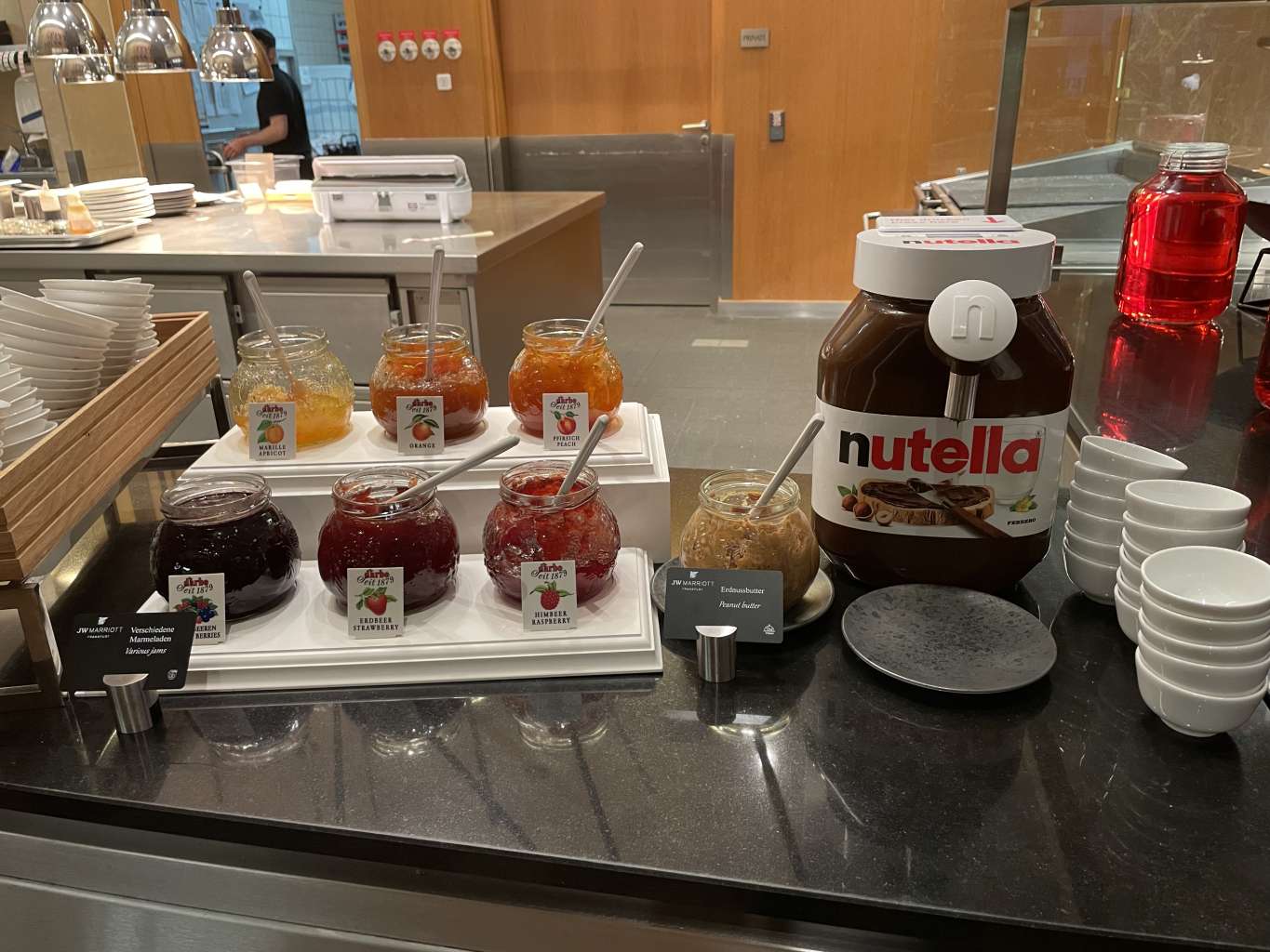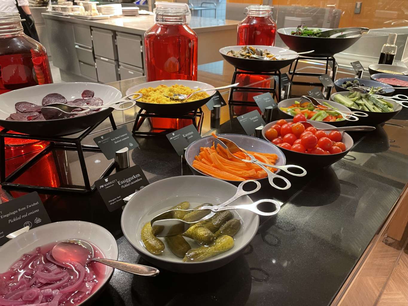 Das Frühstücks-Büffet im JW Marriott Frankfurt endet mit einer Bar bestehend aus Marmeladen, diversen Salaten, eingelegtem Gemüse und ein paar warmen Optionen, wie zum Beispiel Champignons und Würstchen.